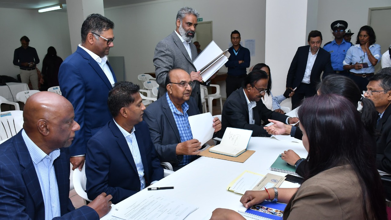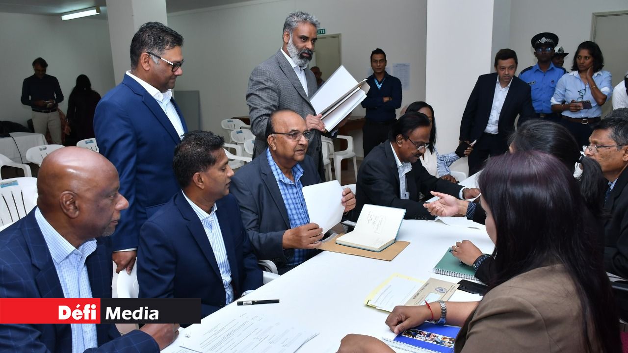 Des membres de l’Alliance Lepep (MSM/PMSD/ML) se sont rendus aux locaux de la Commission électorale pour faire leur demande d'enregistrement en vue des élections générales ce vendredi 11 octobre. Parmi les membres, on peut voir Maneesh Gobin, Joe Lesjongard, Tulsiraj Benydin et Aurore Perraud.
