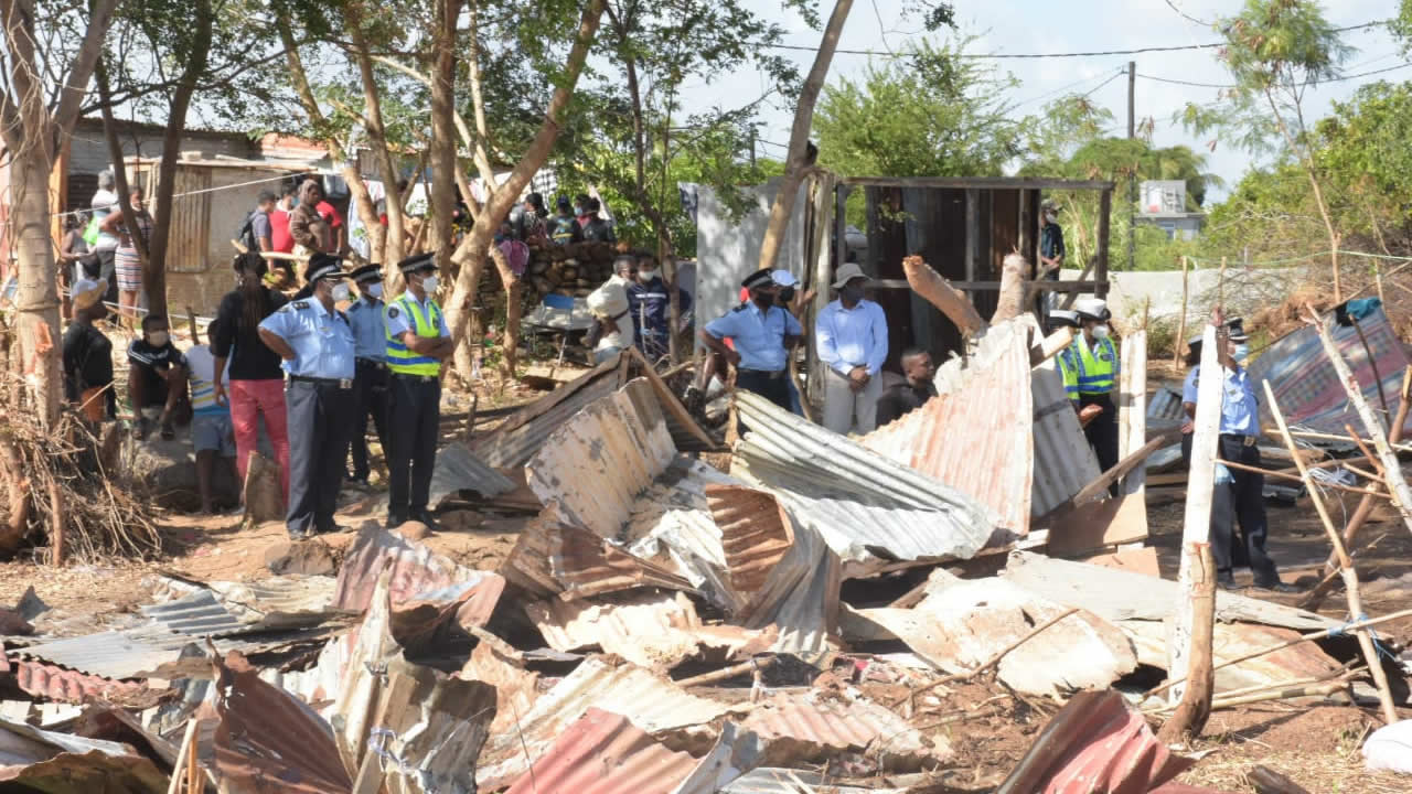 Grosse mobilisation policière à Résidence Jean Blaize, Pointe-aux-Sables, ce vendredi matin 29 mai. Des éléments de la Special Mobile Force et ceux de la Special Supporting Unit, équipés, entre autres, d’un JCB, ont été déployés pour démolir une cinquantaine d’abris construits illégalement sur les lieux.
