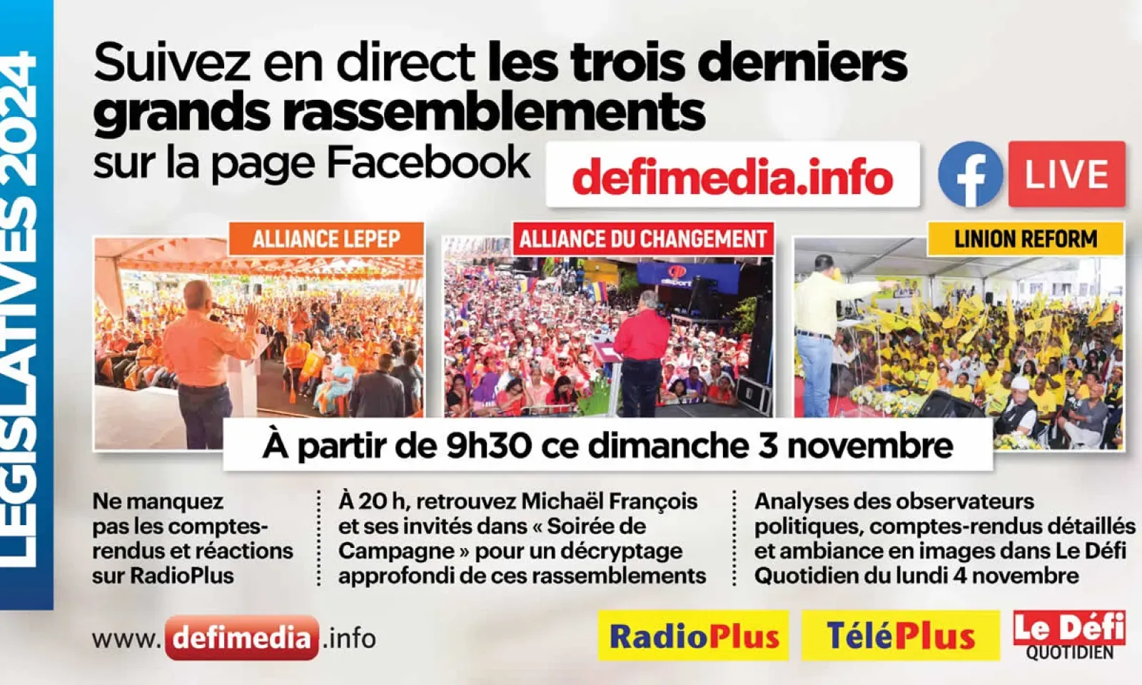 Dernière ligne droite avant les législatives du 10 novembre. Ce dimanche 3 novembre, les deux principaux blocs, à savoir l’Alliance Lepep et l’Alliance du Changement, réunissent leurs partisans à Phoenix et Port-Louis, respectivement, pour leurs derniers grands meetings respectifs.