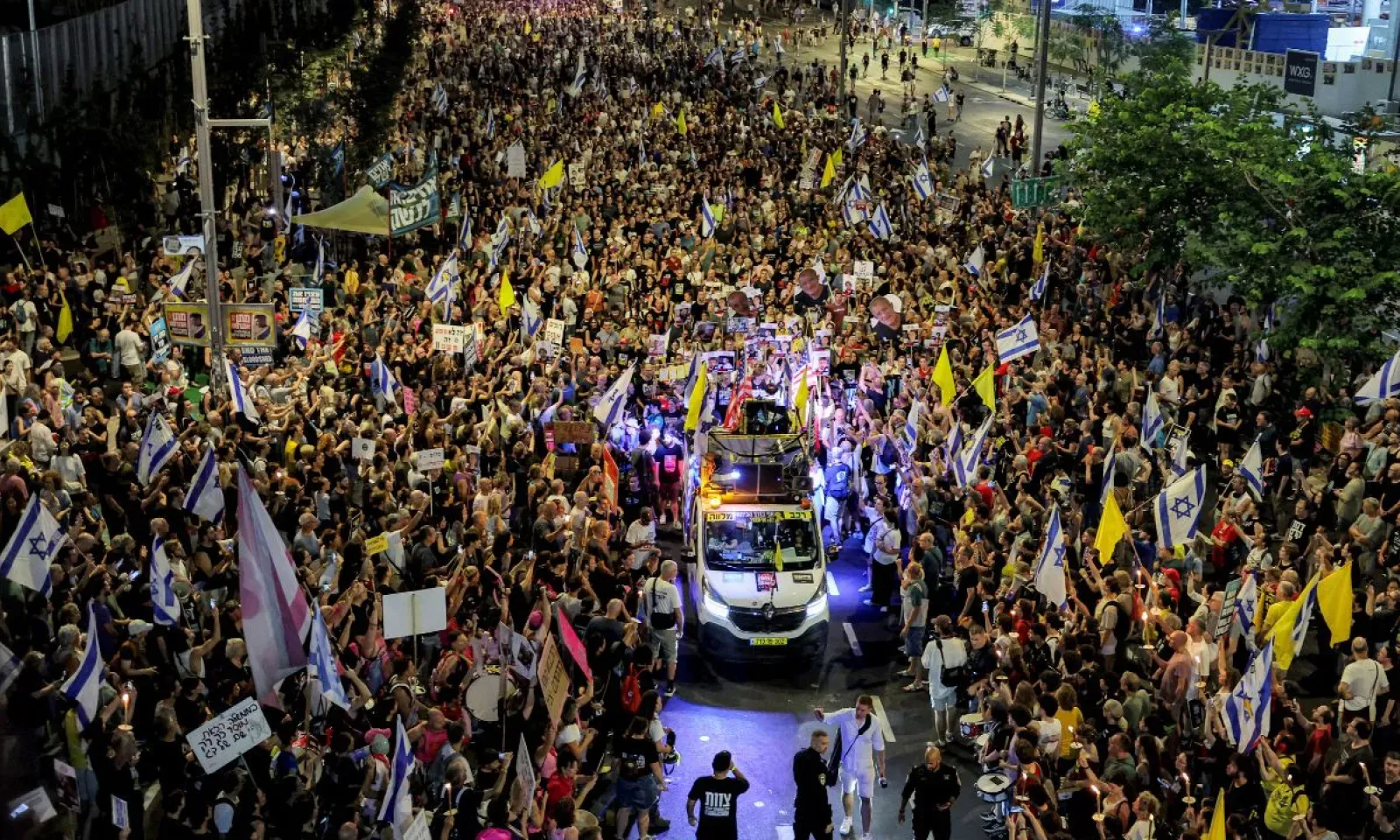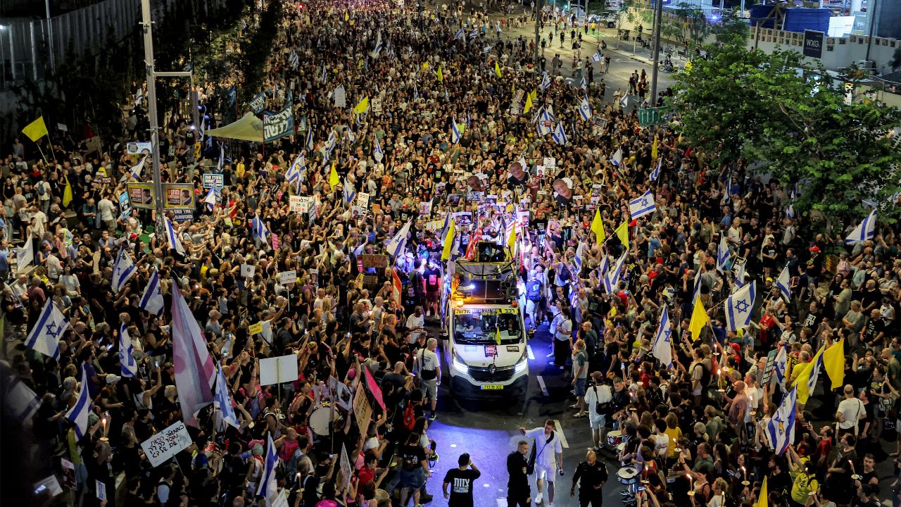 Des dizaines de milliers de manifestants sont descendus samedi à Tel-Aviv pour appeler à la fin de la guerre dans la bande de Gaza, au lendemain de l'annonce du plan israélien pour la conquête de la ville de Gaza, la plus grande du territoire palestinien. Des manifestations ont eu lieu à travers Israël, notamment dans les villes de Haïfa et de Jérusalem.