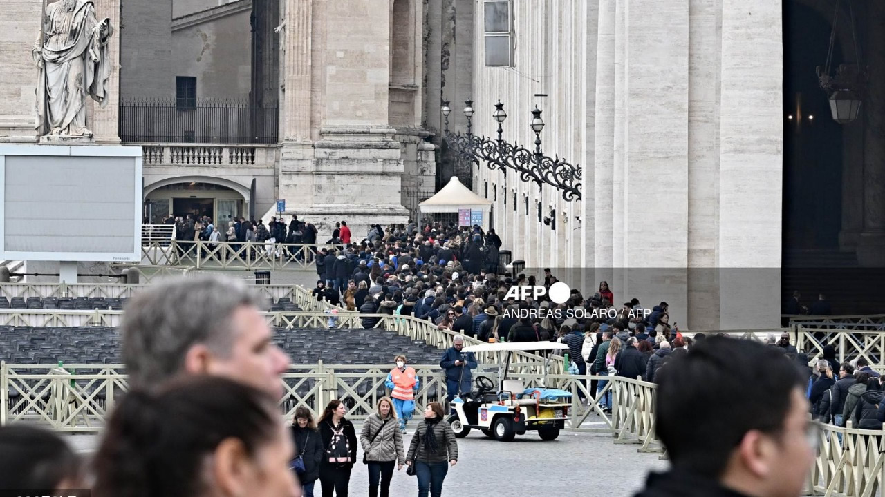Une longue file d'attente serpente depuis l'aube sur la place Saint-Pierre entourée par la colonnade du Bernin, en présence de nombreux médias et d'un millier de membres des forces de l'ordre.