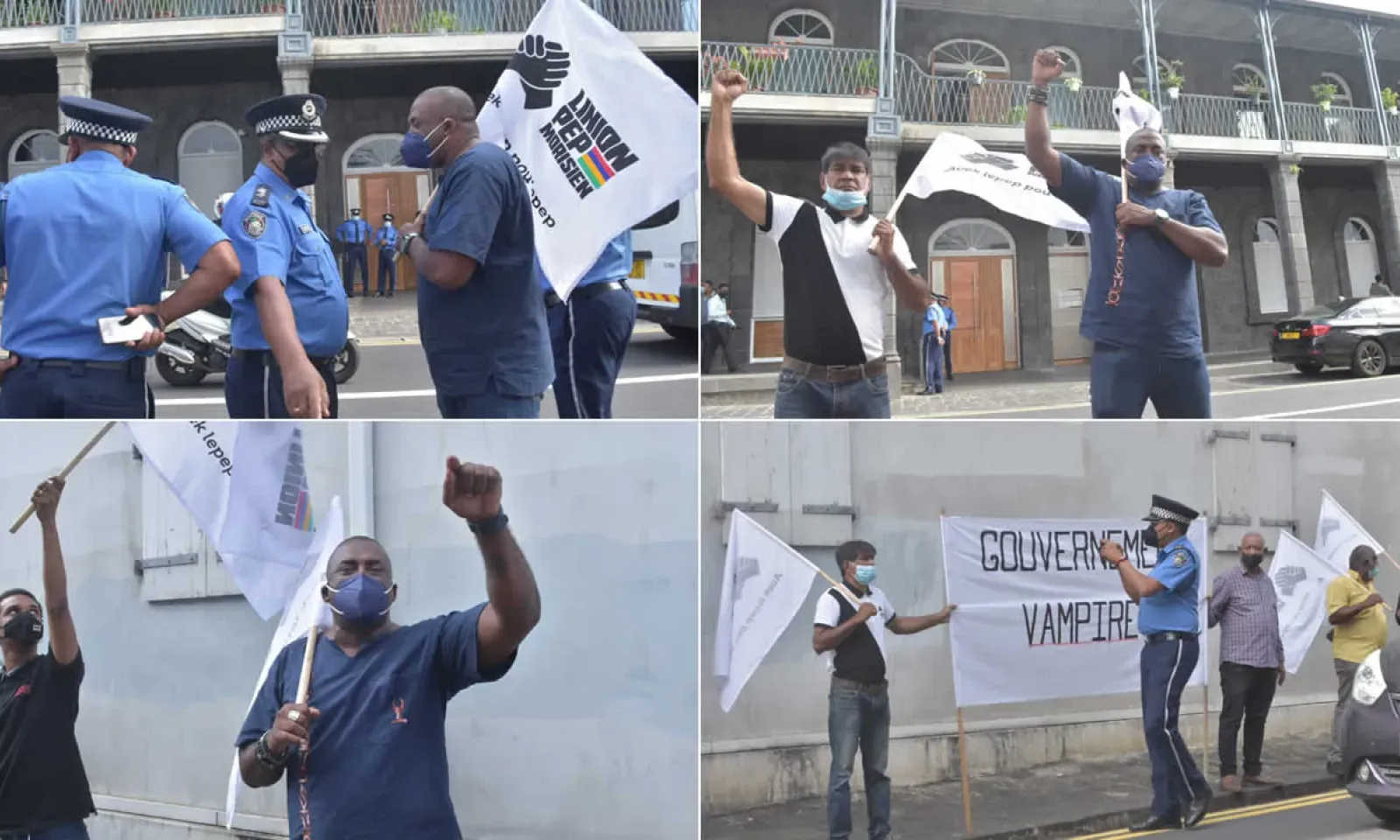 Bruneau Laurette, membre de Linion Pep Morisien, et l’activiste Raouf Khodabaccus, protestent contre la hausse des prix des carburants devant le PMO, Port-Louis, cet après-midi. D’autres membres de Linion Pep Morisien ont participé à cette manifestation, qui a pris fin vers 14 h. Il y avait au total sept manifestants, qui appellent à un « fuel strike » à partir de lundi.