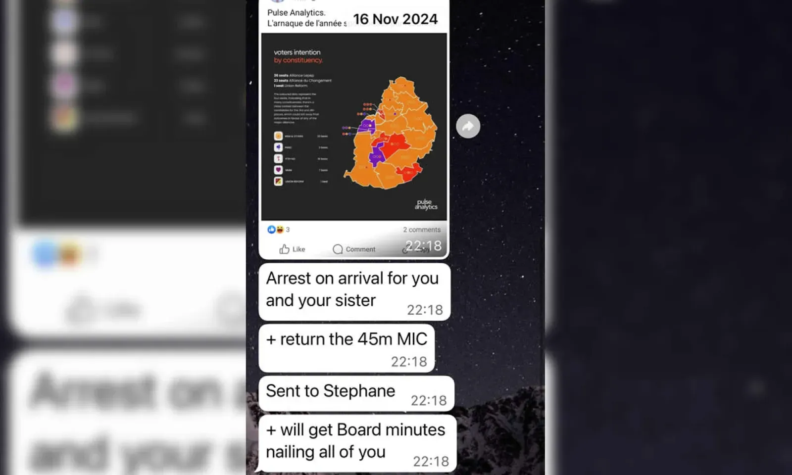 Dans une série de textos envoyés le 16 novembre 2024 à 22 h 18, Tevin Sithanen aurait exigé d’Aditi Boolell le remboursement de « Rs 45 millions de la MIC » tout en évoquant une arrestation à son arrivée dans le pays. « Arrest on arrival for you and your sister », aurait-il écrit, avant d’ajouter : « + return the 45m MIC », « Sent to Stephane » et « will get Board minutes nailing all of you ».