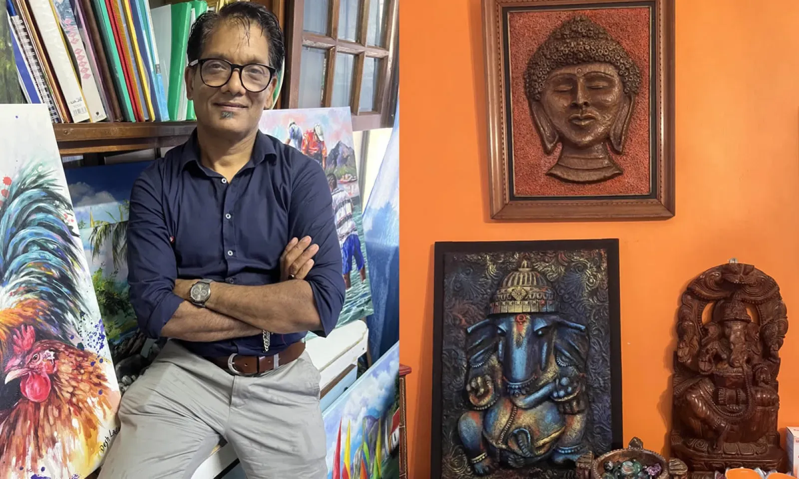 À Vacoas, où il est domicilié, tout respire la création artistique, les espaces étant mis en valeur à l’aide de tableaux ou de motifs sculptés. « J’ai voulu créer des conditions de manière à donner libre cours à mes intuitions créatives », explique Desh Ladkoo, titulaire d’une maitrise en beaux-arts du Mahatma Gandhi Institute (MGI). Très influencé par les grands maitres de la peinture classique et certains impressionnistes, mais aussi par l’insularité de Maurice, il s’en inspire pour composer ses créations. « Je suis davantage dans une composition picturale propre à notre île, à la fois réaliste et impressionniste, plutôt que dans la reproduction mécaniste », indique-t-il.