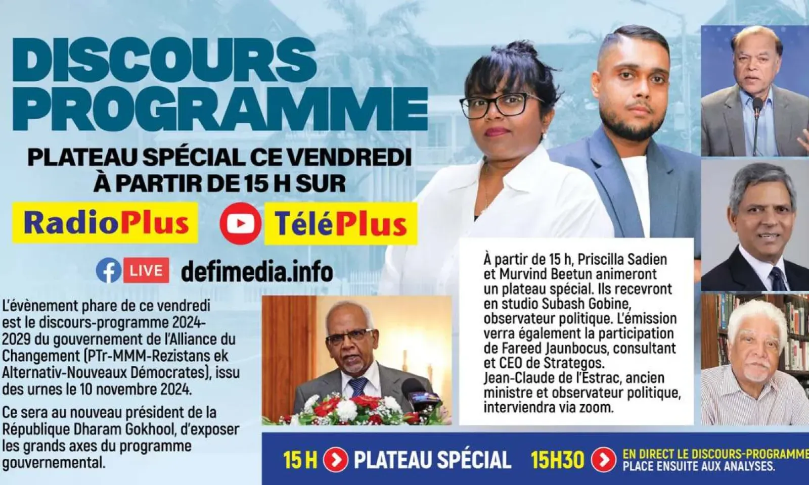 À partir de 15 h, Priscilla Sadien et Murvind Beetun animeront un plateau spécial. Ils recevront en studio Subash Gobine, observateur politique. L’émission verra également la participation de Fareed Jaunbocus, consultant et CEO de Strategos.