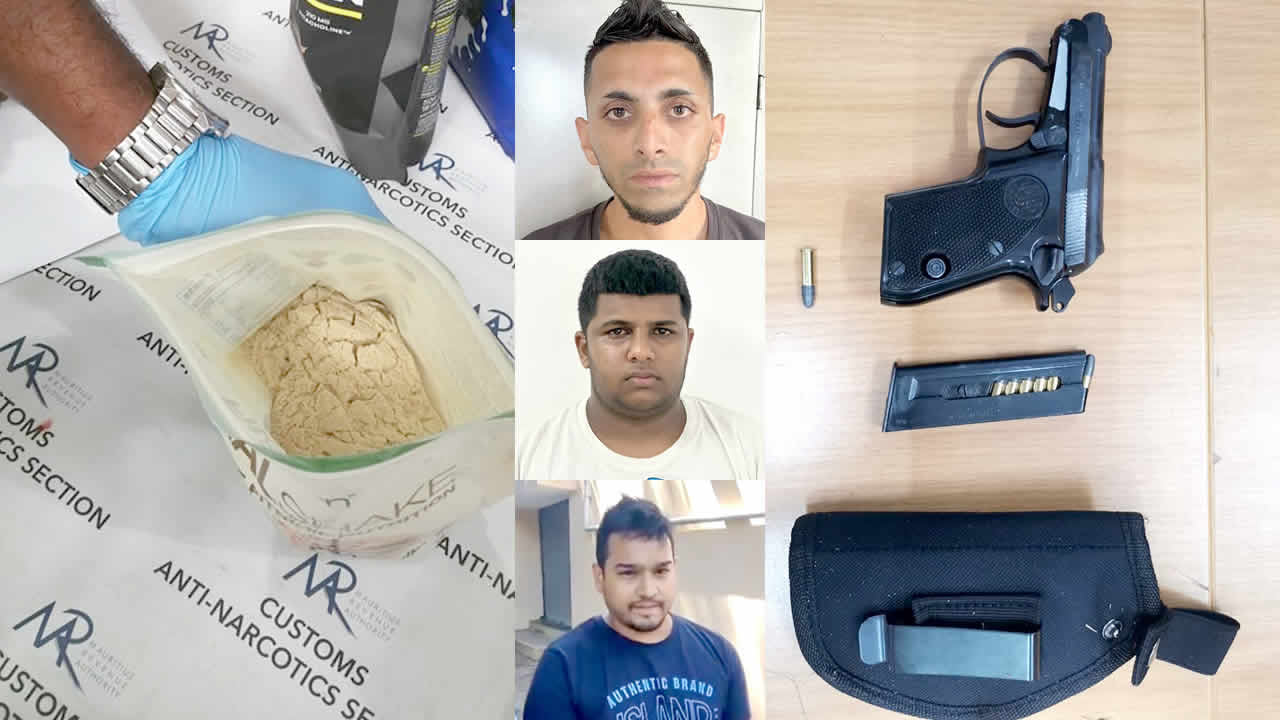 Après avoir sécurisé la drogue, les agents de l’Adsu ont mis sur pied une opération de « controlled delivery », le vendredi 8 décembre afin de remonter jusqu’aux contacts locaux. Cet exercice a conduit à l’arrestation, à Flic-en-Flac, de trois jeunes habitants de Quatre-Bornes. Il s’agit d’Andy Ambea, 25 ans, gérant d’une compagnie de location de voitures et qui réside à la route Bassin, et de deux autres habitants de Palma, Daniket Rummun, 20 ans, et Vinesh Ruttun, 29 ans. Ce dernier avait en sa possession, lors de son interpellation, une arme à feu de la marque Beretta et huit balles. Ses cartes bancaires, trois portables, ainsi que la somme de Rs 6 050 ont été saisies par les policiers. Pour sa part, Andy Ambea avait sur lui un montant de Rs 4 200.