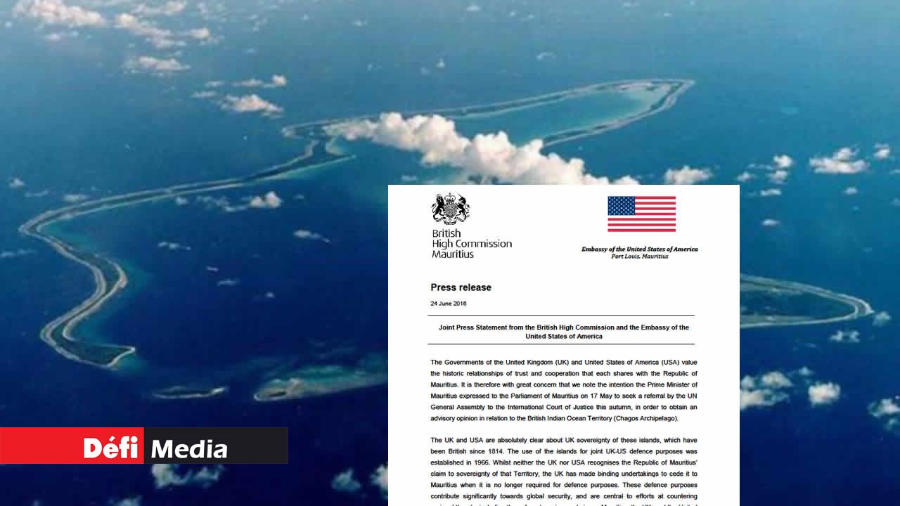 Le Royaume-Uni et les États-Unis affirment que c’est « avec une grande inquiétude » qu’ils notent l’intention exprimée par le Premier ministre mauricien sir Anerood Jugnauth à l’Assemblée nationale le 17 mai « to seek a referral by the UN General Assembly to the International Court of Justice this autumn, in order to obtain an advisory opinion in relation to the British Indian Ocean Territory (Chagos Archipelago) ».