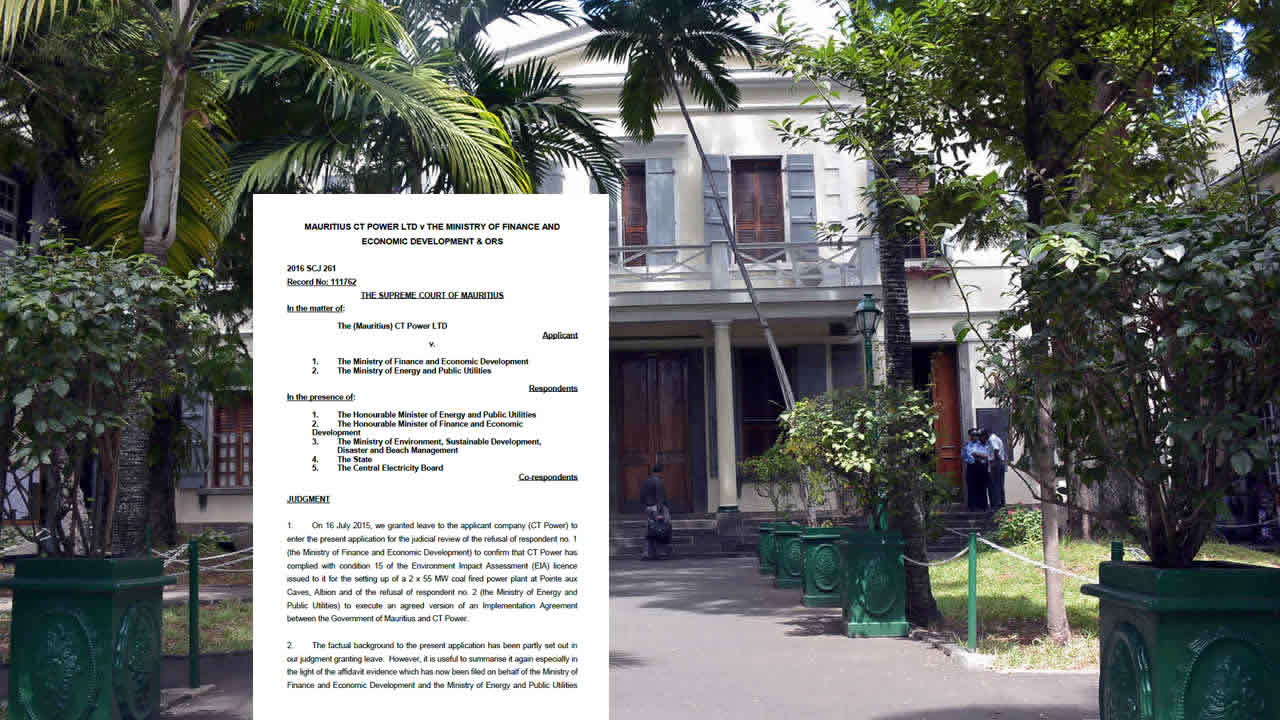 CT Power contestait par voie de révision judiciaire la décision des autorités mauriciennes de mettre un frein à son projet de centrale à charbon dans la région de Pointe-aux-Caves, Albion. Les juges Ah Foon Cui Yew Cheong et Rita Teelock ont statué que la décision du ministère des Finances de rejeter la « Letter of Comfort » de CT Power était en violation des attentes légitimes de la firme malaisienne. Les juges ont conclu aussi que les raisons invoquées par le ministère de l’Energie pour ne pas signer l’accord d’implémentation sont « erronées, déraisonnables et irrationnelles ». Le ministère des Finances et le ministère de l’Energie n’ont pas signé l’Implementation Agreement avec CT Power, car ils ont estimé que la firme n’a pu soumettre des preuves satisfaisantes concernant sa capacité financière à mener le projet de centrale à charbon à Pointe-aux-Caves. C’est alors que la firme malaisienne avait réclamé une révision judiciaire pour contester cette décision. CT Power était représenté par Mes Désiré Basset, Senior Counsel, et Nandraj Patten et l’avoué Pazany Thandarayen. Me Carol Green-Jokhoo, Acting Parliamentary Counsel, représentait le ministère de l’Énergie. Le ministère des Finances était représenté par Me Mary Jane Lau Yuk Poon, Assistant Solicitor General.