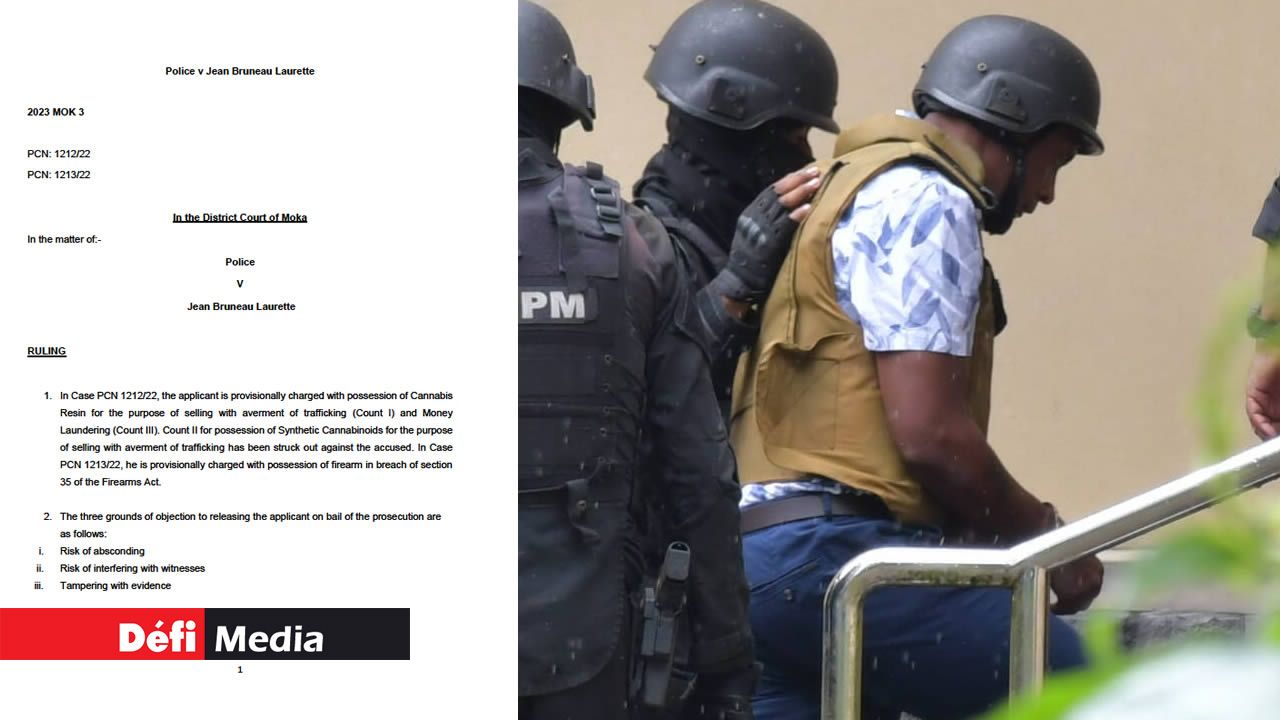 Trois accusations provisoires pèsent sur Bruneau Laurette : possession de plus de 40 kilos de haschich valant plus de Rs 200 millions, possession d’armes à feu et blanchiment d’argent.
