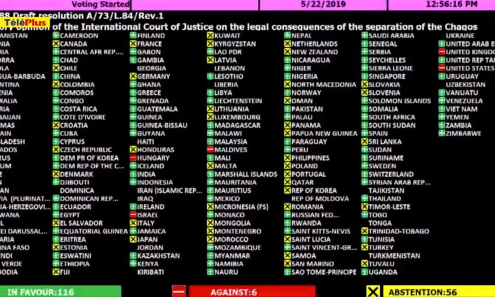 116 pays membres de l’Assemblée générale des Nations Unies ont voté en faveur de la résolution de Maurice sur le dossier Chagos ce mercredi 22 mai. 56 pays se sont abstenus et 6 ont voté contre.