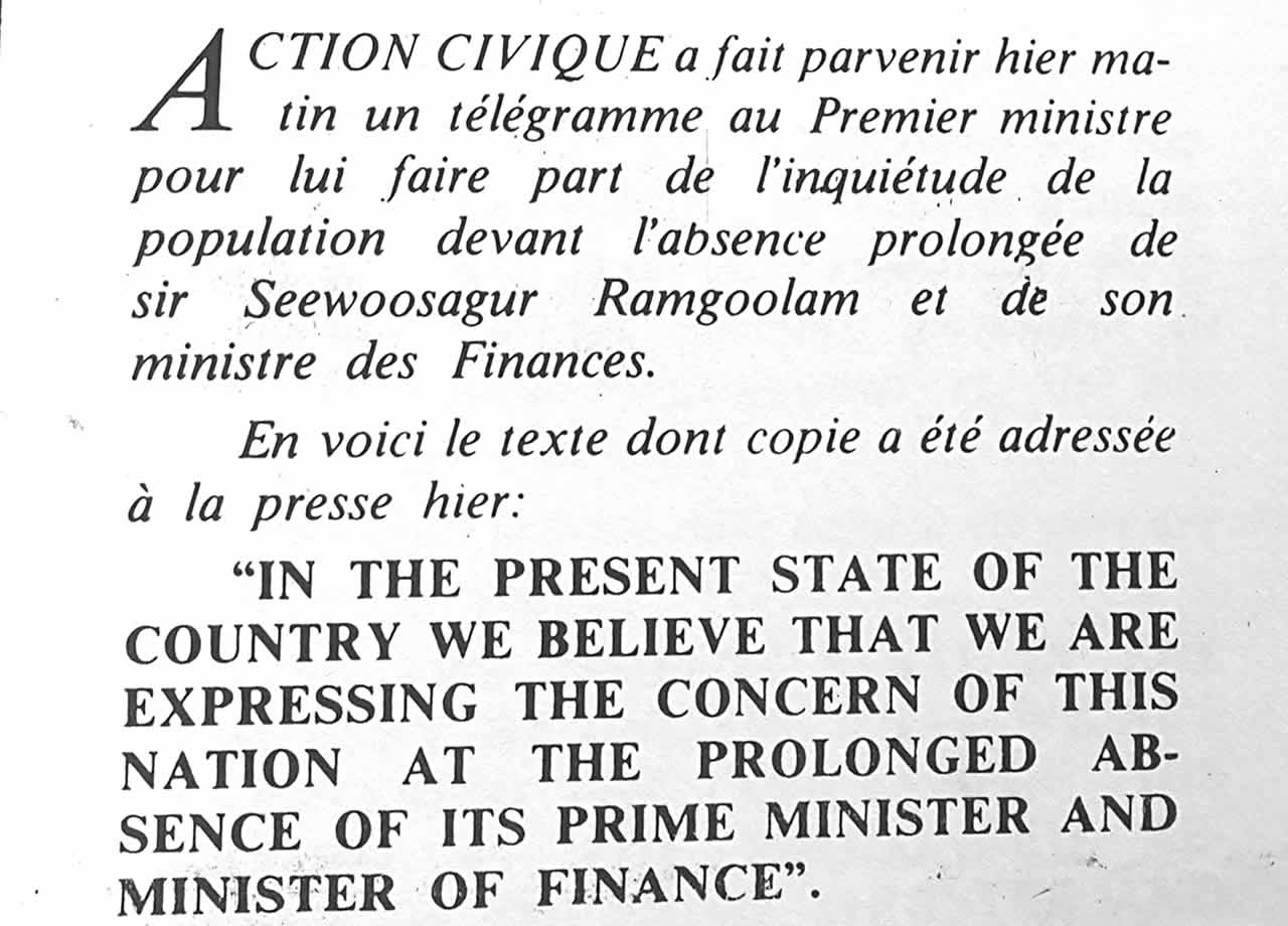 [[{"type":"media","view_mode":"media_large","fid":"19352","attributes":{"class":"media-image size-full wp-image-33287","typeof":"foaf:Image","style":"","width":"1280","height":"920","alt":"Coupure de presse du t\u00e9l\u00e9gramme qu"}}]] Coupure de presse du télégramme qu'il avait envoyé à sir Seewoosagur Ramgoolam demandant à ce dernier de rentrer au pays.