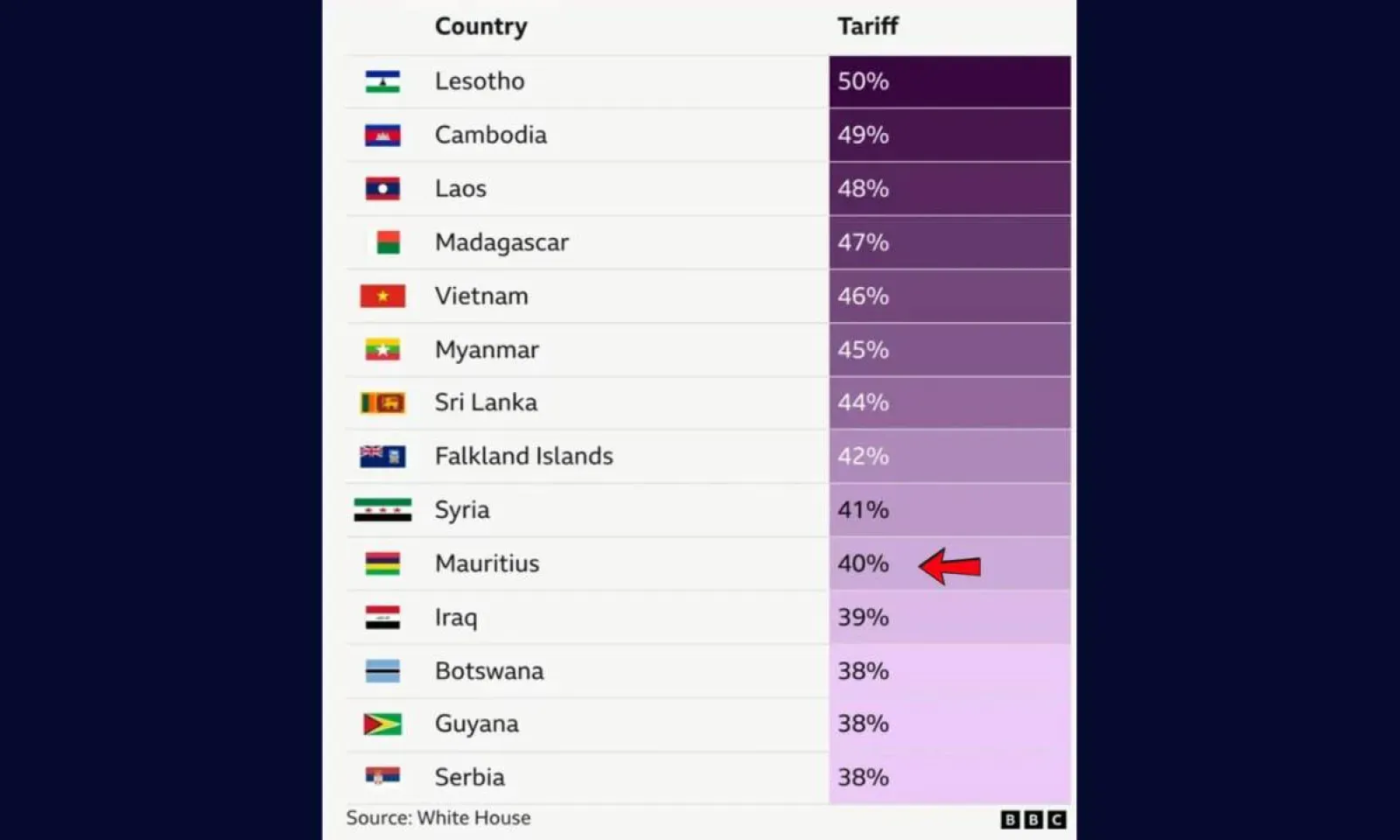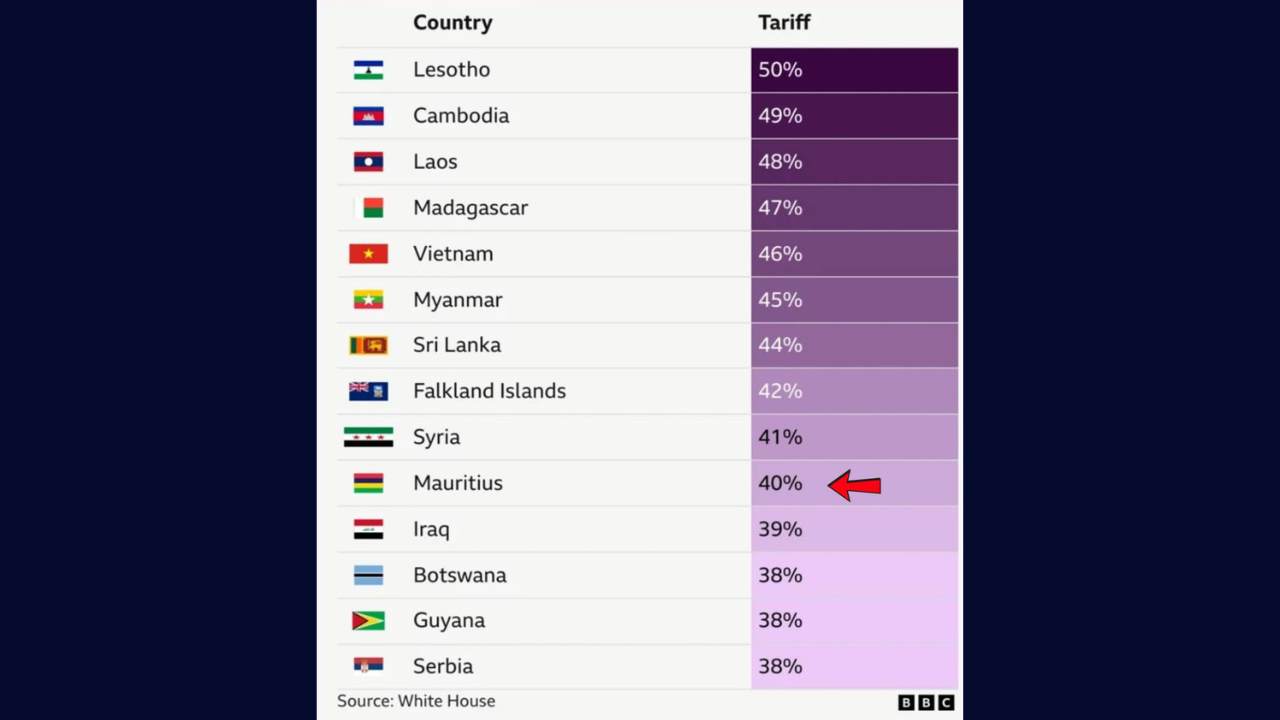 Dans un article paru sur le site de la BBC, Maurice figure parmi les dix pays ayant les nouveaux tarifs douaniers les plus élevés imposés par les États-Unis. Le président américain, Donald Trump, a annoncé ces nouveaux tarifs pour plusieurs grands pays lors de son discours le mercredi 2 avril. Cependant, la liste complète a été publiée par la Maison Blanche ce jeudi 3 avril.