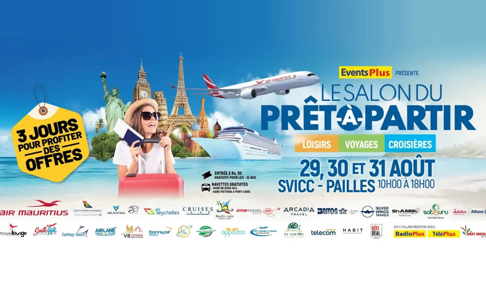 Le Salon du Prêt-à-Partir se tiendra les 29, 30 et 31 août au Swami Vivekananda International Convention Centre (SVICC), de 10 h à 18 h. L’entrée est fixée à Rs 50, gratuite pour les enfants de moins de 12 ans. Des navettes gratuites seront disponibles depuis le Victoria Urban Terminal à Port-Louis et depuis la gare de Rose-Hill.
