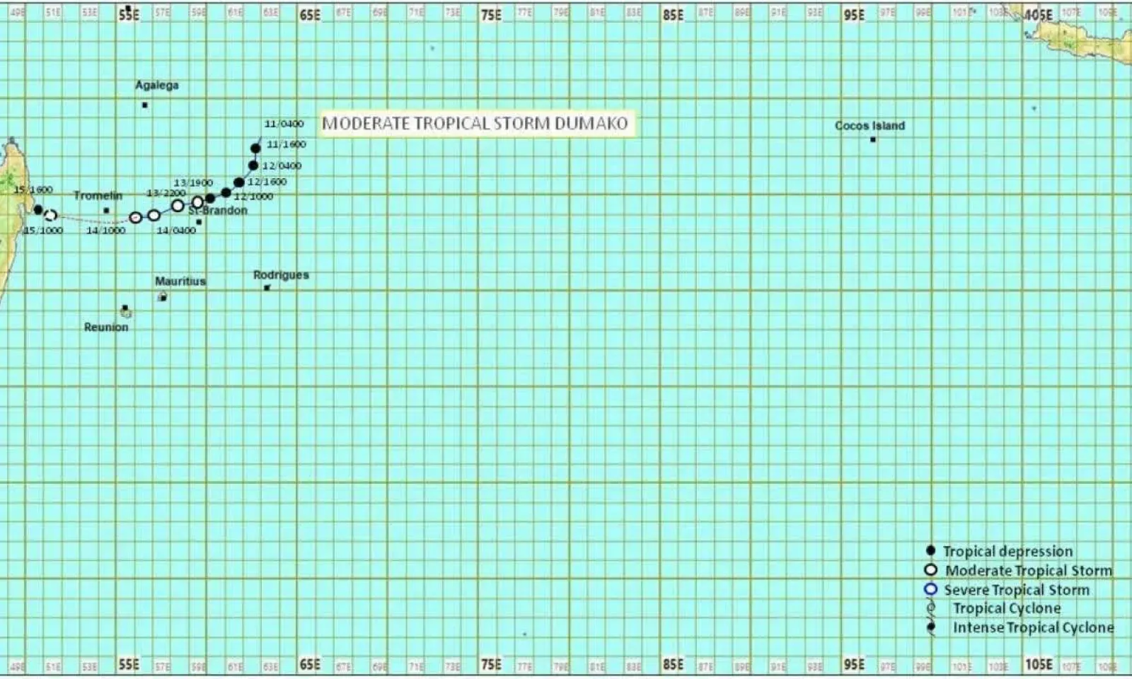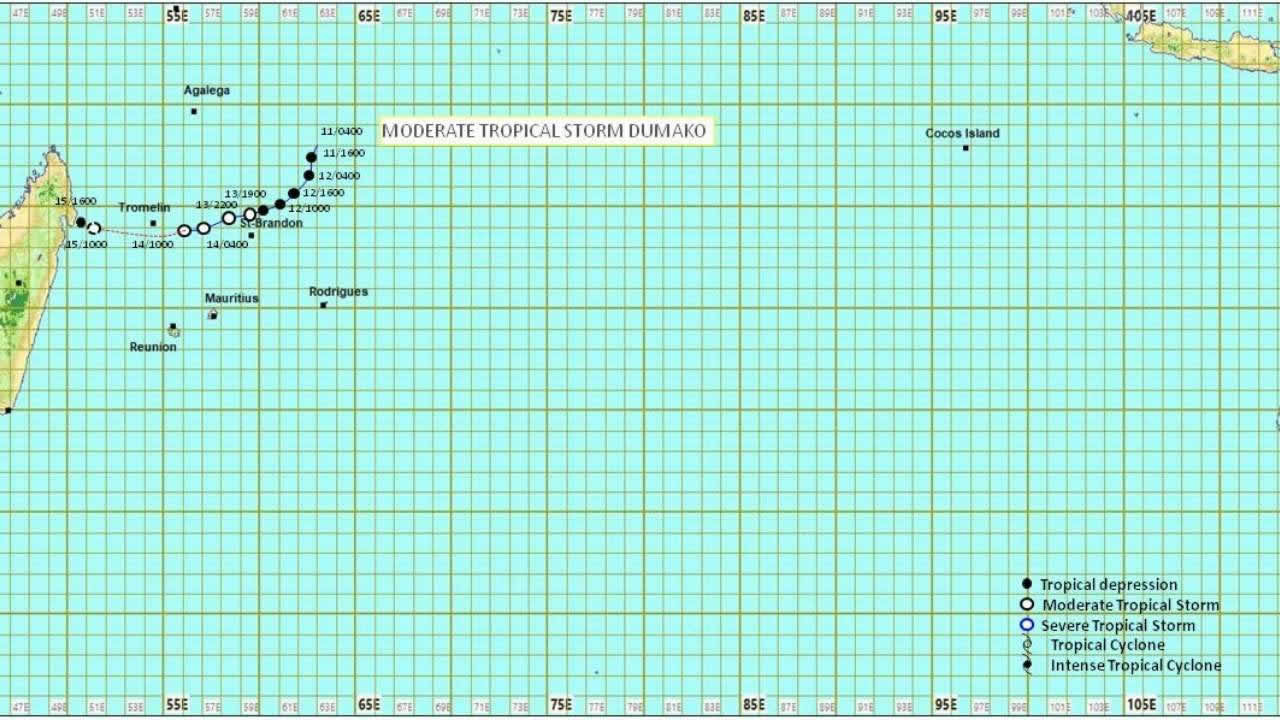 À 10 heures ce lundi matin, 14 février, la tempête tropicale modérée Dumako, de faible diamètre, était centrée à environ 16,2 degrés sud et 56,1 degrés est, soit à environ 440 km au nord-nord-ouest de Grand-Baie. Elle se déplace dans une direction générale de l’ouest à environ 25 km/h. Sur cette trajectoire, Dumako se dirige vers Madagascar et ne représente pas une menace pour l’île Maurice.