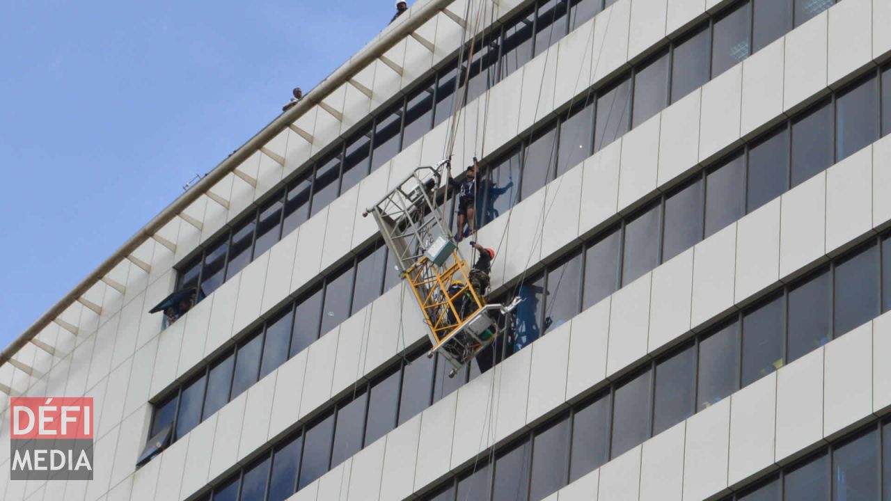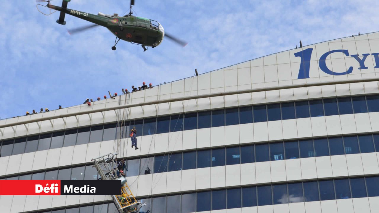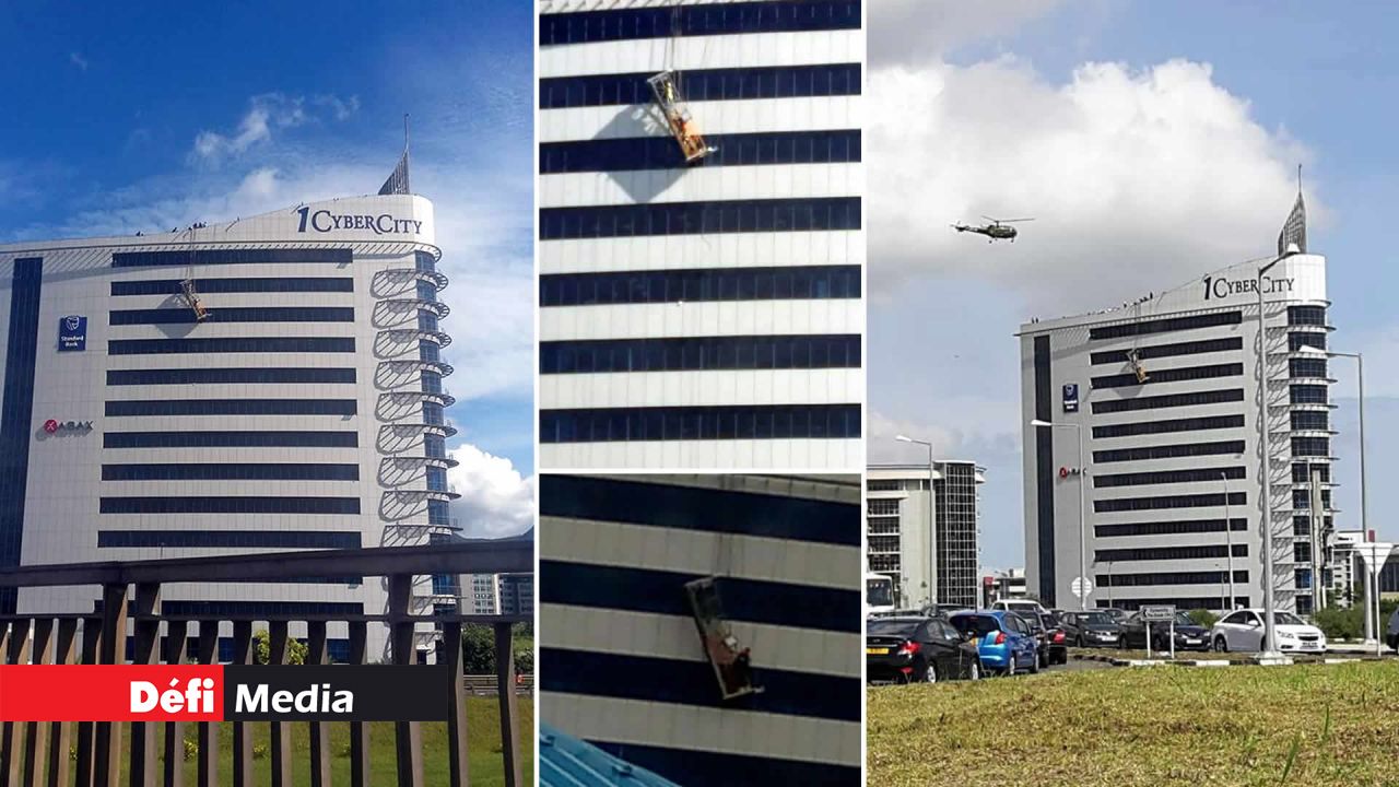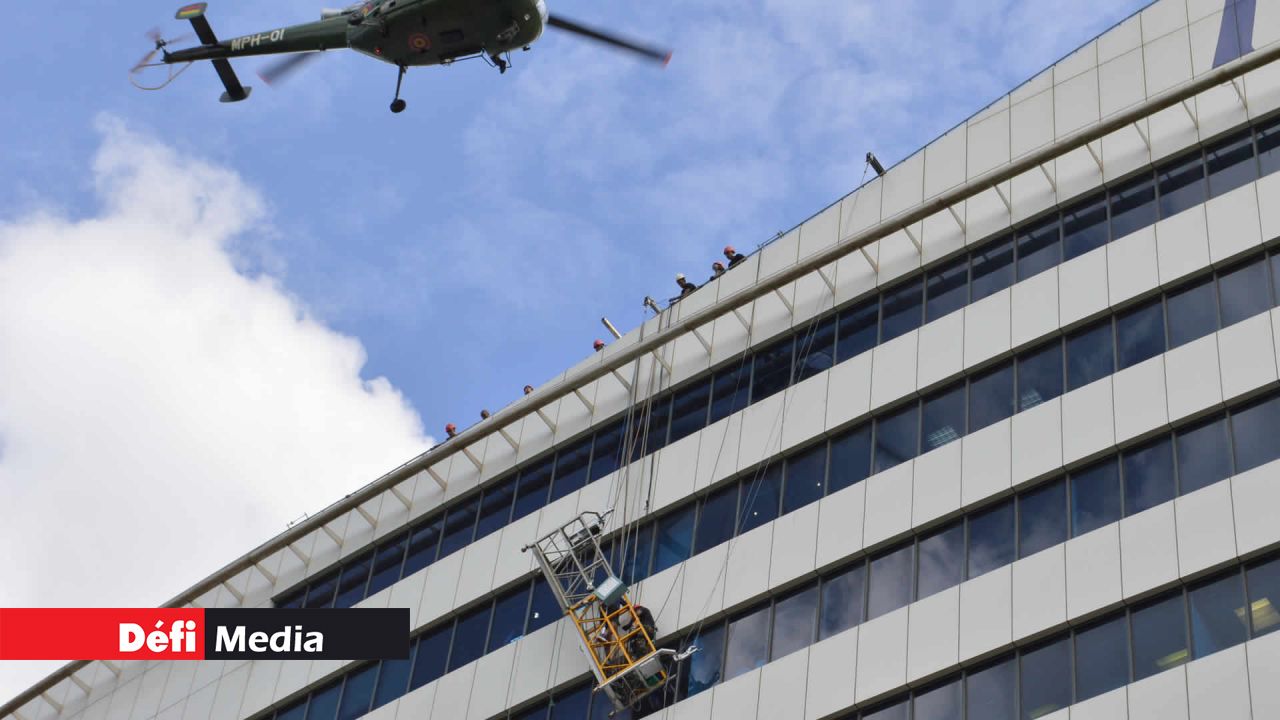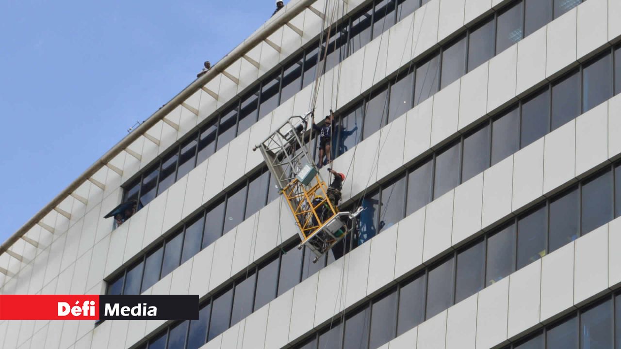 Une opération a eu lieu vers 9 heures à Ebène pour sauver trois « cleaners ». Ces derniers, qui procédaient au nettoyage des vitres à l’extérieur d’un bâtiment de 13 étages au CyberTour d’Ebène, se sont retrouvés en difficulté après qu’un des quatre câbles soutenant une nacelle sur laquelle ils se trouvaient a cédé.