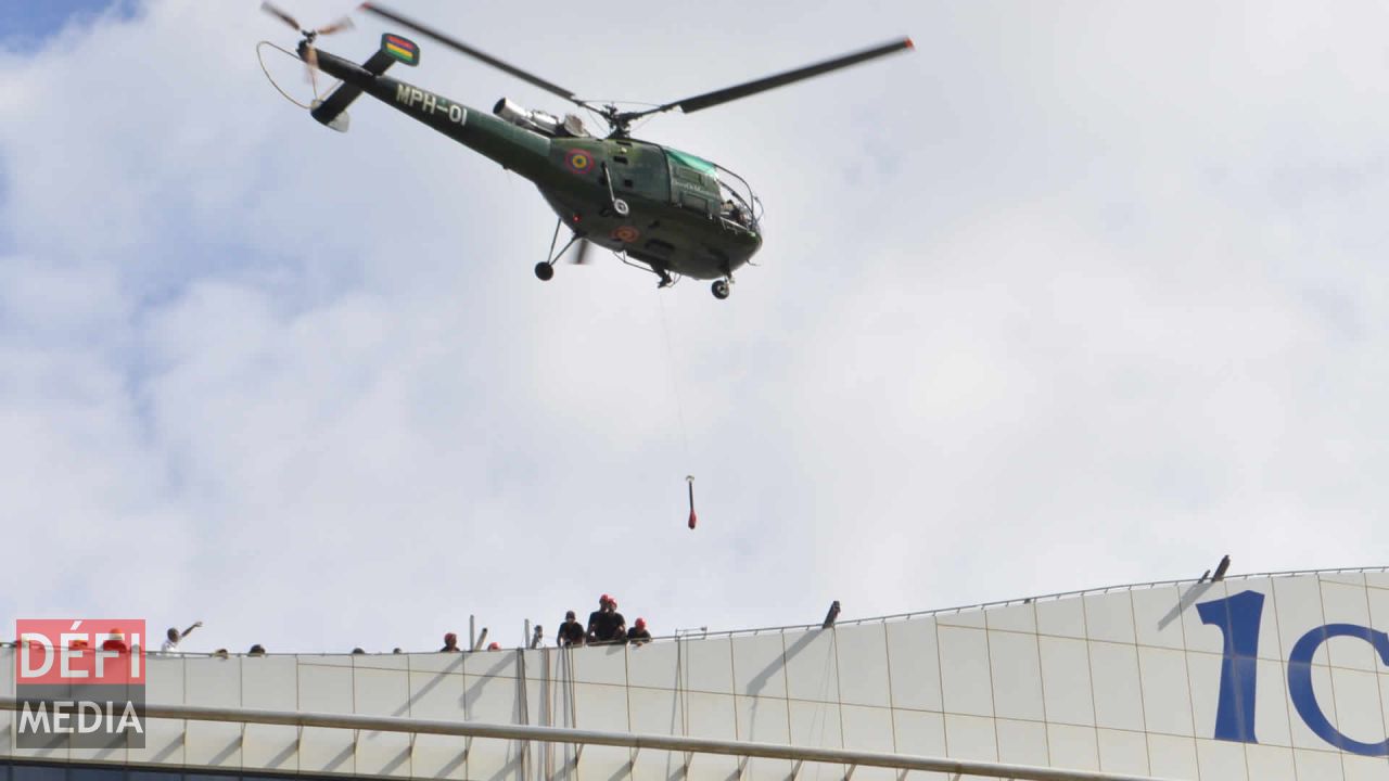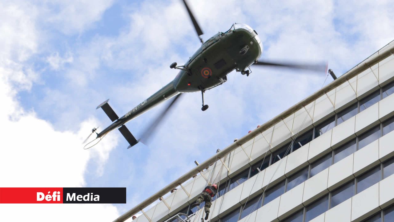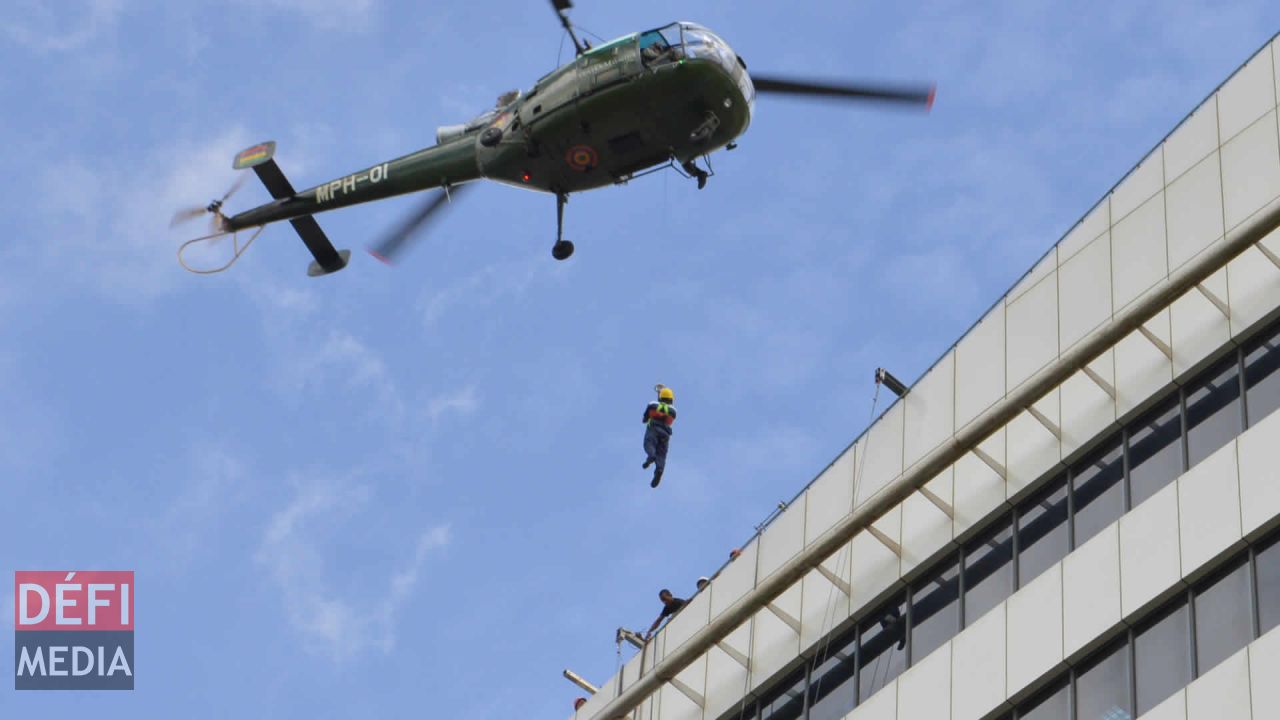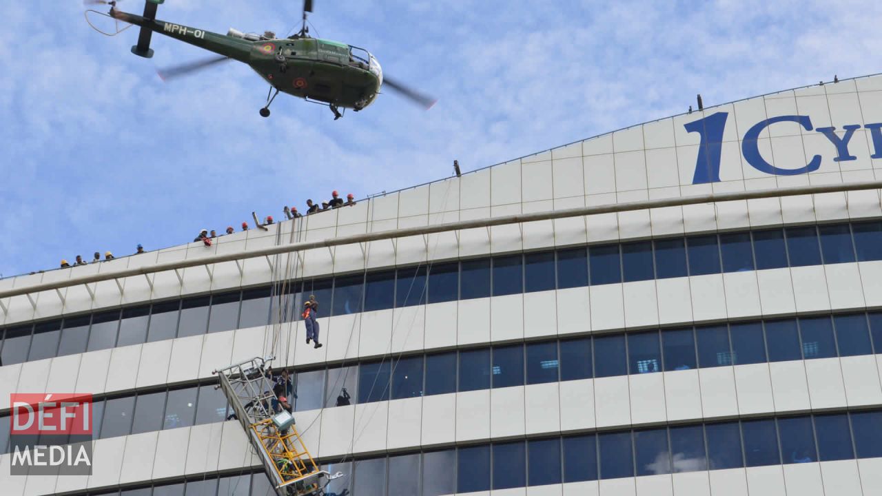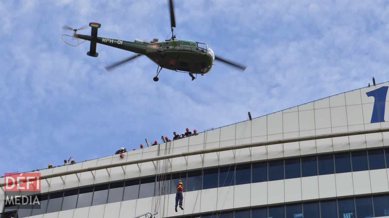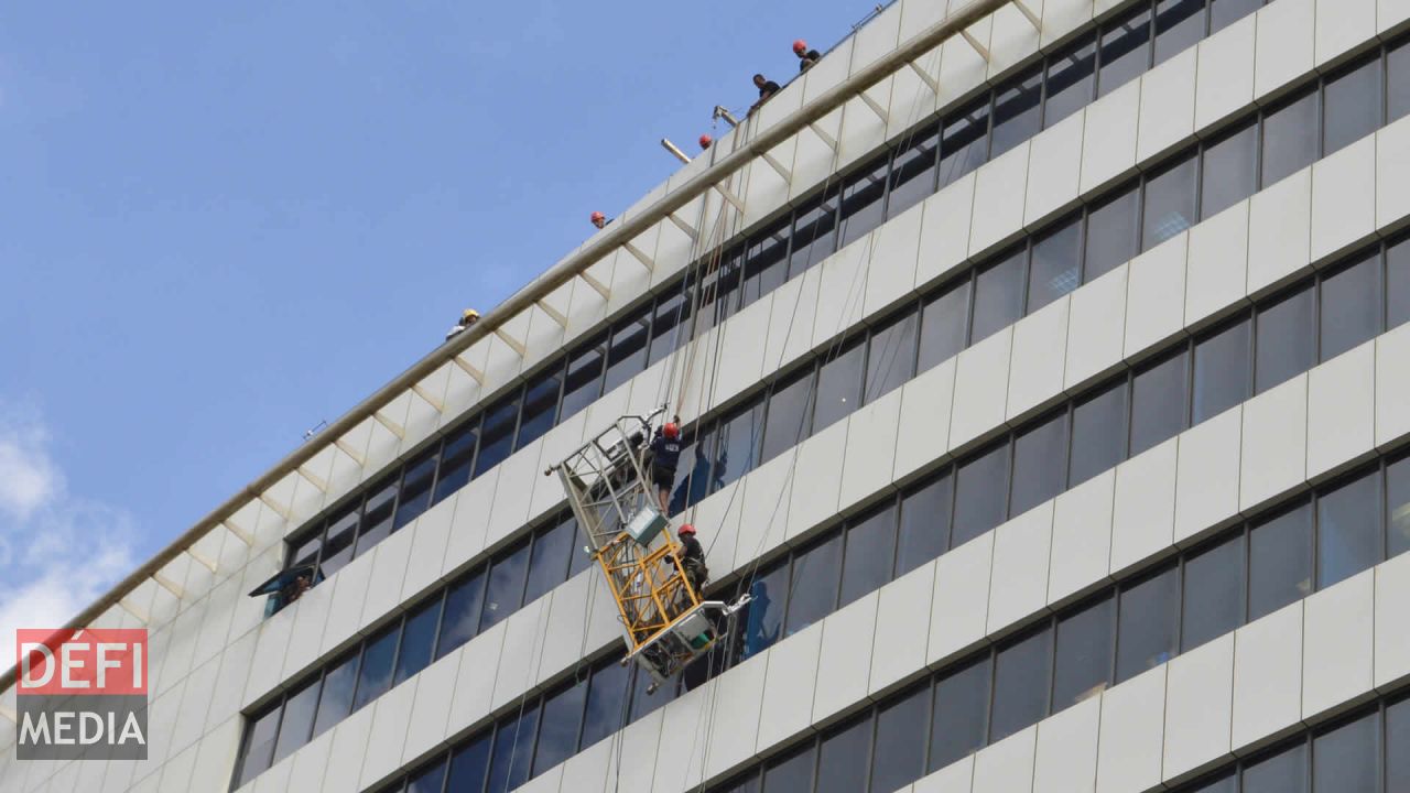 Une opération a eu lieu vers 9 heures à Ebène pour sauver trois « cleaners ». Ces derniers, qui procédaient au nettoyage des vitres à l’extérieur d’un bâtiment de 13 étages au CyberTour d’Ebène, se sont retrouvés en difficulté après qu’un des quatre câbles soutenant une nacelle sur laquelle ils se trouvaient a cédé.