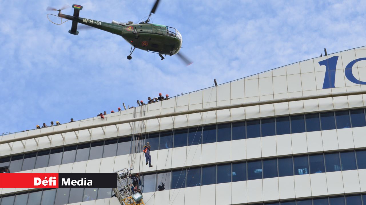 Trois « cleaners » d’Alpha Cleaning se sont se trouvés en difficulté vers 8 heures alors qu’ils étaient sur une nacelle élévatrice et nettoyaient les vitres au 12e étage à l’extérieur du bâtiment 1CyberCity ; nacelle qui d’un coup s’est retrouvée suspendue à la verticale.