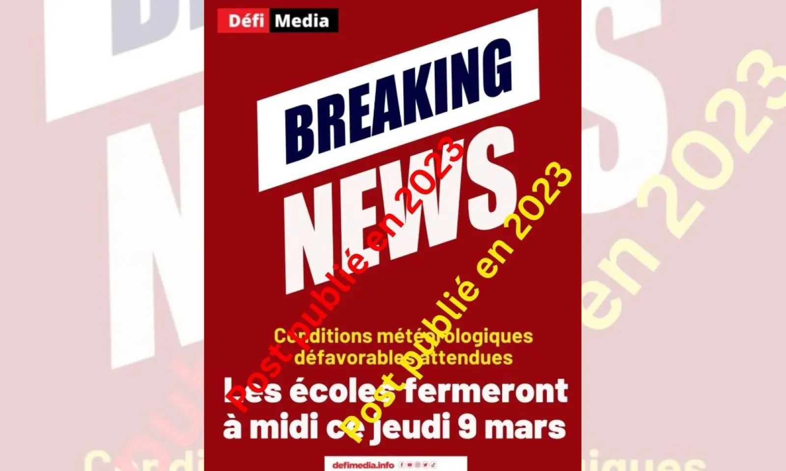 Un post publié sur defimedia.info l'année dernière est de nouveau en circulation sur les réseaux sociaux ce mardi 5 mars, mais sans l'article qui accompagnait le post initial. Ce post laisse croire que les écoles fermeront à midi ce jeudi. Or, la date de cette année indique clairement qu'on sera le 7 mars ce jeudi et non le 9 mars (date de l'année dernière). Ce post peut donc créer de la confusion chez plusieurs élèves et parents, d'autant qu'il n'y avait pas de classes ce mardi en raison du mauvais temps.