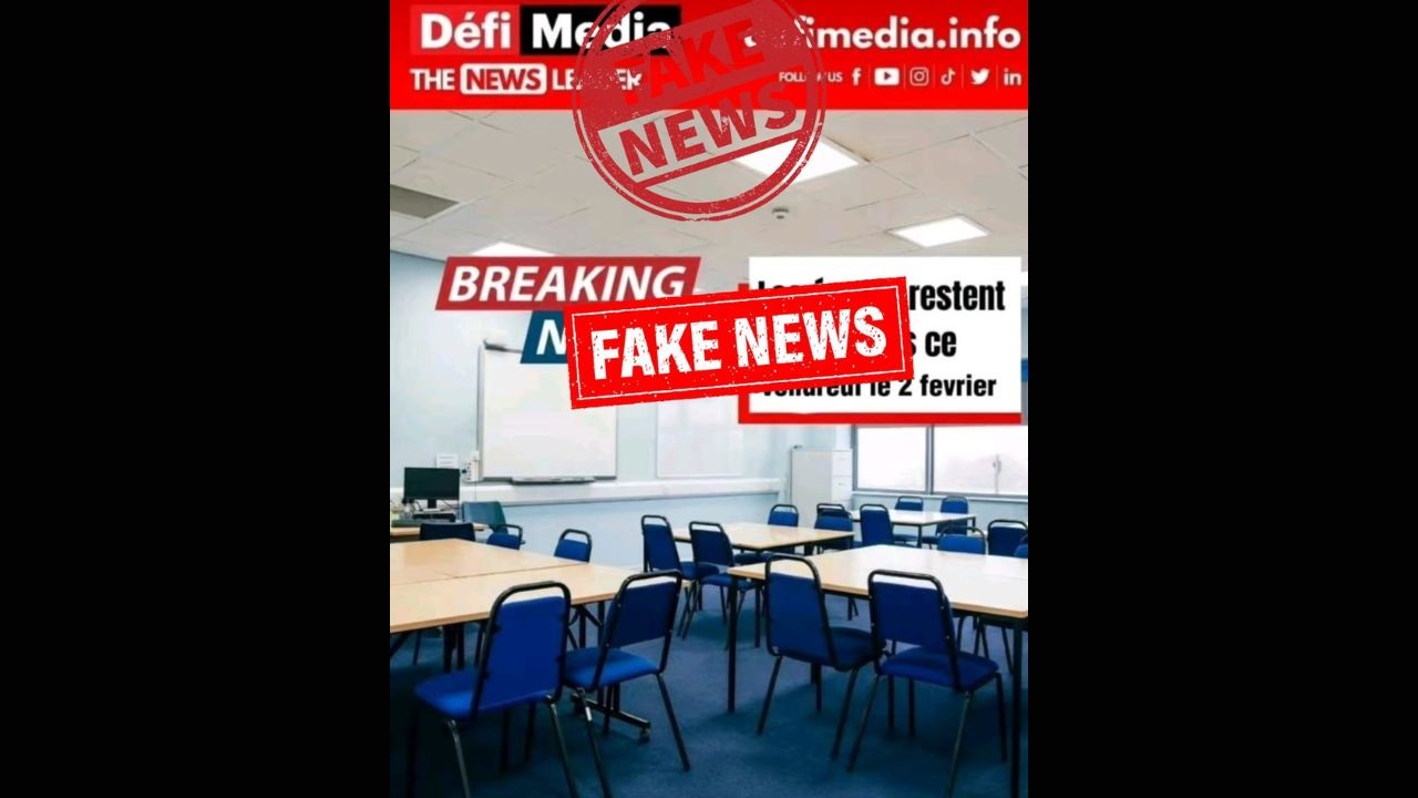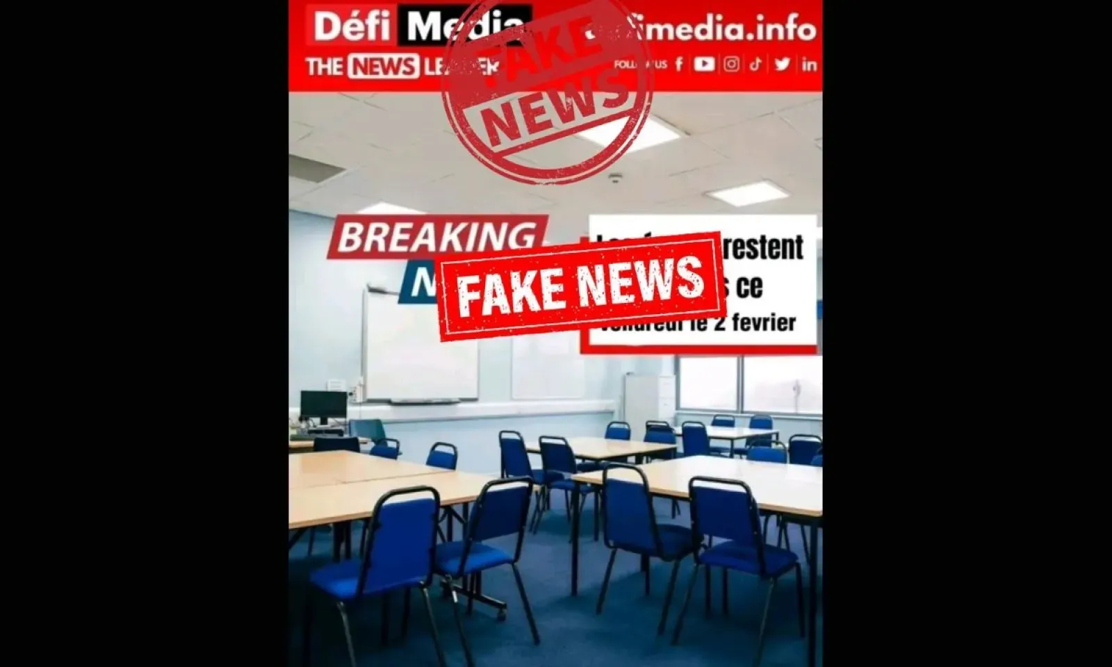 Il a été porté à notre connaissance, ce jeudi soir 1ᵉʳ février, qu'un poste portant le nom du Défi Media et notre logo, faisant accroire que les « écoles resteront fermées » ce vendredi 2 février circule sur WhatsApp. Il s’agit d’une «fake news».