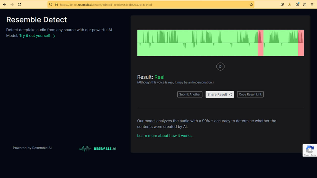 Mais pour en être quasiment sûrs, les journalistes ont passé certaines bandes sonores dans un détecteur de deepfakes. Il s’agit du site internet detect.resemble.ai. À chaque fois, le logiciel a déterminé que les sons n’ont pas été générés par une IA. Le Défi Plus en a fait de même. Nous avons téléchargé les sons en format MP3 de trois récentes vidéos de « Missier Moustass ». Notons que le site revendique un taux de réussite de l’ordre de 90 %. Les captures d’écran de ces tests sont à visionner plus bas. Dans les trois cas, le logiciel qualifie les sons de réels.