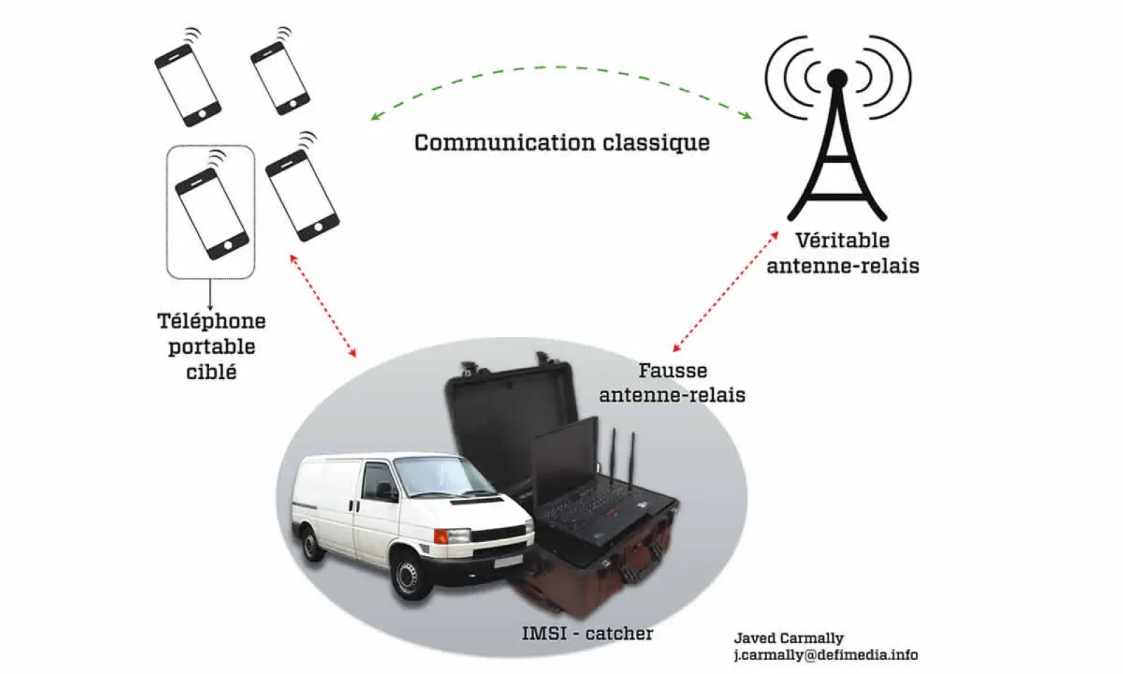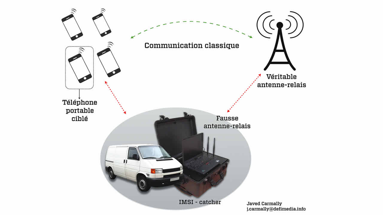 S’ils ont décidé d’écouter une conversation faite à partir d’un numéro, ils surveillent les appels entrants et sortants. Désormais, le IMSI-Catcher va opérer comme une vraie antenne relais pour ce cellulaire. Et à son tour, le IMSI-Catcher pourra se mettre en lien avec l’opérateur de téléphonie du numéro ciblé grâce à la « fausse antenne » qui est sur la valise (voir infographie). Tout cela, sans que l’utilisateur ne soit au courant de rien. Et toutes les communications peuvent être interceptées : e-mail, Whatsapp, Facebook, SMS, les historiques de connexion Internet… Que le téléphone soit 2G, 3G ou 4G.