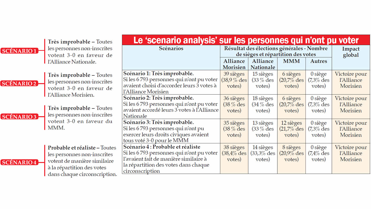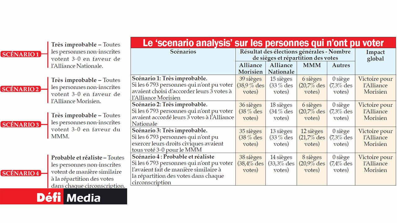 Scénario 1: Très improbable. Si les 6 793 personnes qui n’ont pu voter avaient choisi d’accorder leurs 3 votes à l’Alliance Morisien |