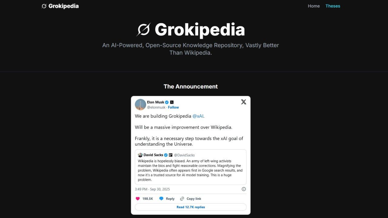 Il y a une semaine, l'entrepreneur avait décidé de reporter de quelques jours le lancement de Grokipedia, annoncé fin septembre, un délai justifié par la nécessité d'effectuer "un travail supplémentaire pour purger la propagande".