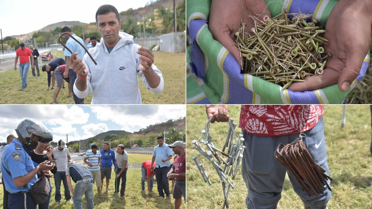 Des employés du MTC ont été choqués ce matin en découvrant des barres de fer et d’autres « pièges » dont des clous sur la piste du Champ de Mars, plus précisément au poteau de 900 mètres. Une plainte a été déposée à la police. Des officiers de la CID se sont rendus sur place. Une opération a par la suite eu lieu pour enlever les barres de terre et ramasser les clous qui jonchaient la piste. Une décision sera prise après 11 h ce samedi quant au maintien ou pas de la journée hippique d’aujourd’hui.