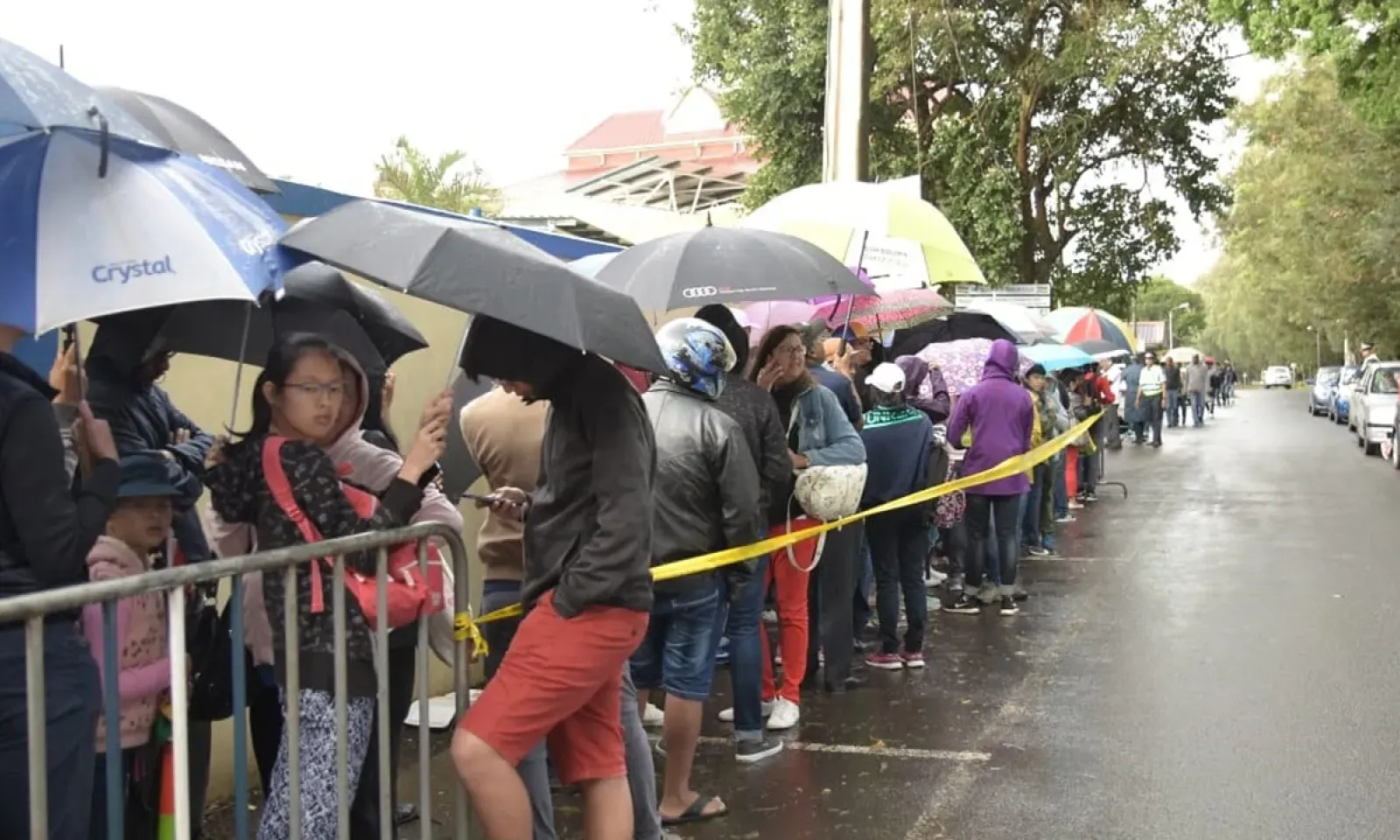 Les photos ci-dessous montrent une longue file d'attente devant le gymnase Pandit Sahadeo à Maurice.