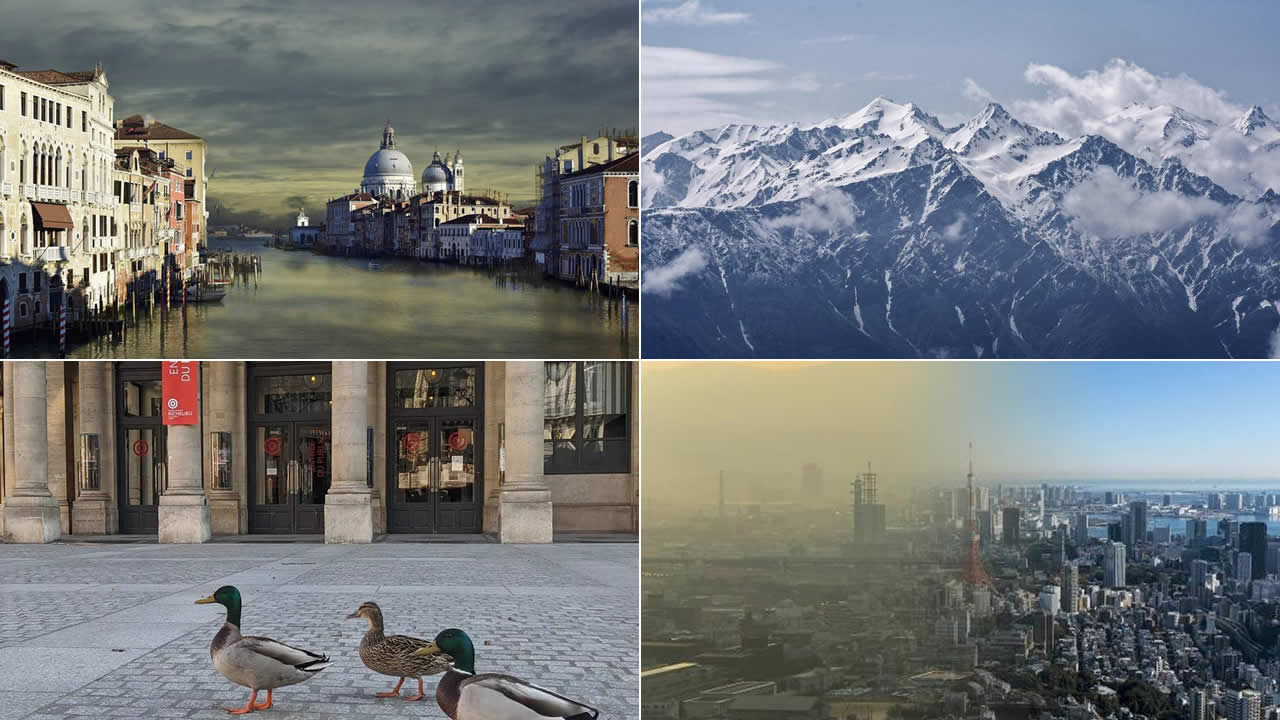 Italie- Les canaux de Venise ne sont plus remués et leurs eaux redeviennent claires et limpides- Photo : peggy choucairInde- Grâce à la baisse de la pollution, les sommets de l'Himalaya sont de nouveau visibles à 200 km : Illustration par Atul BhatLes images de la NASA montrent la baisse de la pollution atmosphérique sur la Chine à un degré plus bas suite aux restrictions de circulation et la baisse de l'activité industrielleParis- Des canards se baladent dans les rues de Paris, vides, lors du confinement. Photo : AFP/Hassan AyadiC’est un air — presque — pur que respirent les Chinois. L’épidémie, devenue pandémie, de coronavirus a entraîné une baisse des activités industrielles chinoises, des restrictions de circulation et des vols domestiques. Résultats, les émissions de CO2 ont été réduites de 15% à 40% dans le secteur industriel, rapporte le site Carbon Brief. Photo : ALXEYPNFEROV/ISTOCK