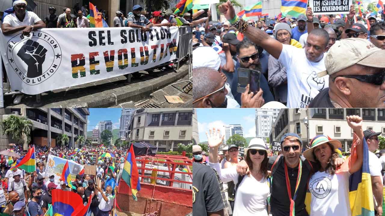 On peut lire des slogans comme « Sel solution : révolution », « Zot pe vend nou pei. Zeness-toi qui to dir ?? », « La révolte des anges au paradis » ou encore « Gouvernement Jugnauth, dehors ».
