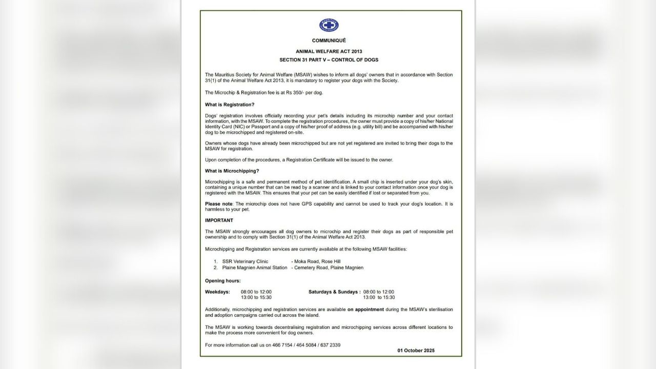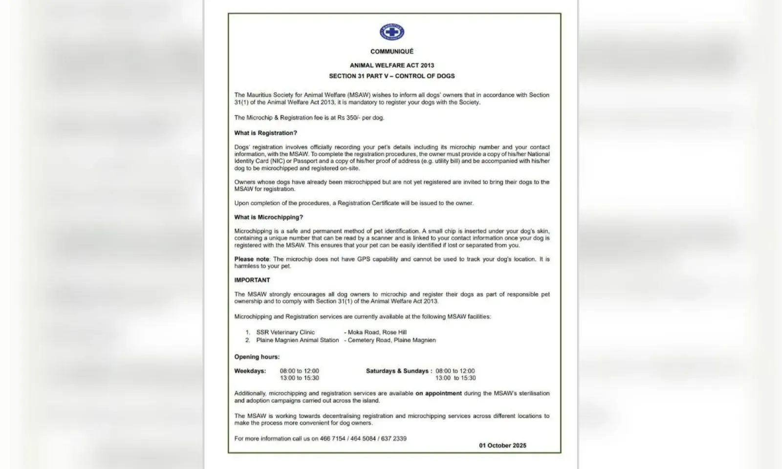 À partir de ce mercredi 1er octobre, l'enregistrement des chiens devient obligatoire à Maurice. Selon un communiqué émis par la Mauritius Society for Animal Welfare (MSAW), le coût total pour l’implantation de la puce électronique et l’enregistrement est de Rs 350 par chien.