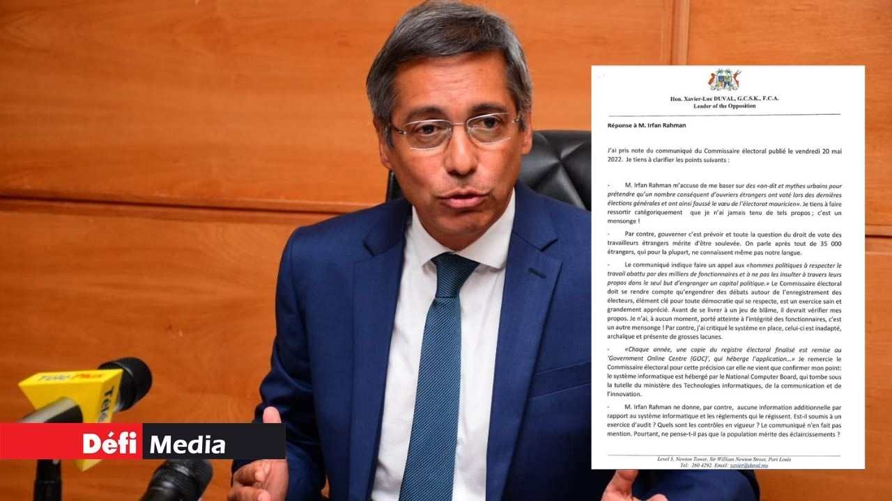 Le leader de l’opposition, Xavier-Luc Duval répond au communiqué publié par le bureau électoral le 20 mai dernier à son encontre. Il a envoyé une correspondance en ce sens à Irfan Rahman, le commissaire électoral, ce lundi.