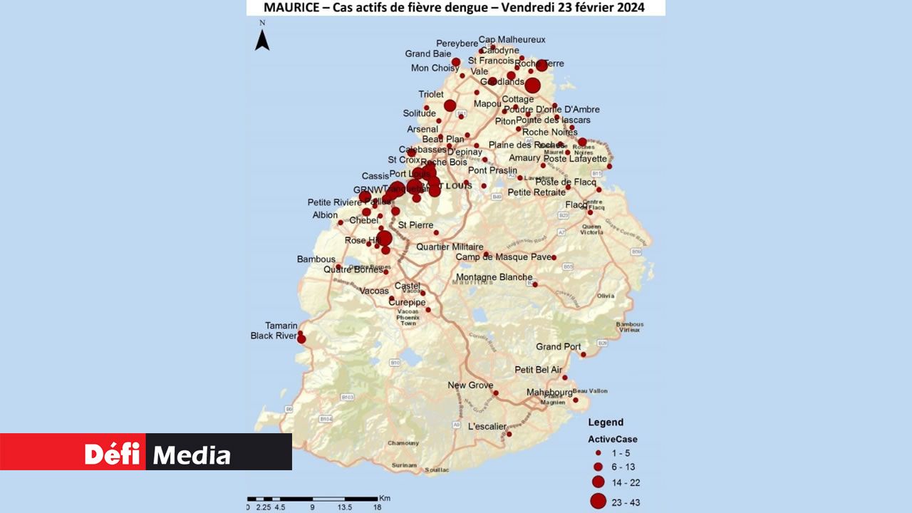 Le nombre de cas de dengue ne cesse de progresser. Le pays comptait 520 cas actifs au vendredi 23 février. 1 486 cas ont officiellement été rapportés depuis le 11 décembre 2023. La maladie semble se propager un peu plus à Port-Louis et aux localités avoisinantes depuis le début de l’épidémie le 11 décembre 2023. Certaines régions ont enregistré entre 14 à 22 cas, et d'autres entre 23 à 43 cas. Le virus est un peu plus présent dans les basses Plaines Wilhems et touche aussi davantage de villages dans la région nord. Des cas isolés ont également été constatés du côté de l'ouest, de l'est et du sud-est. (Voir la carte).