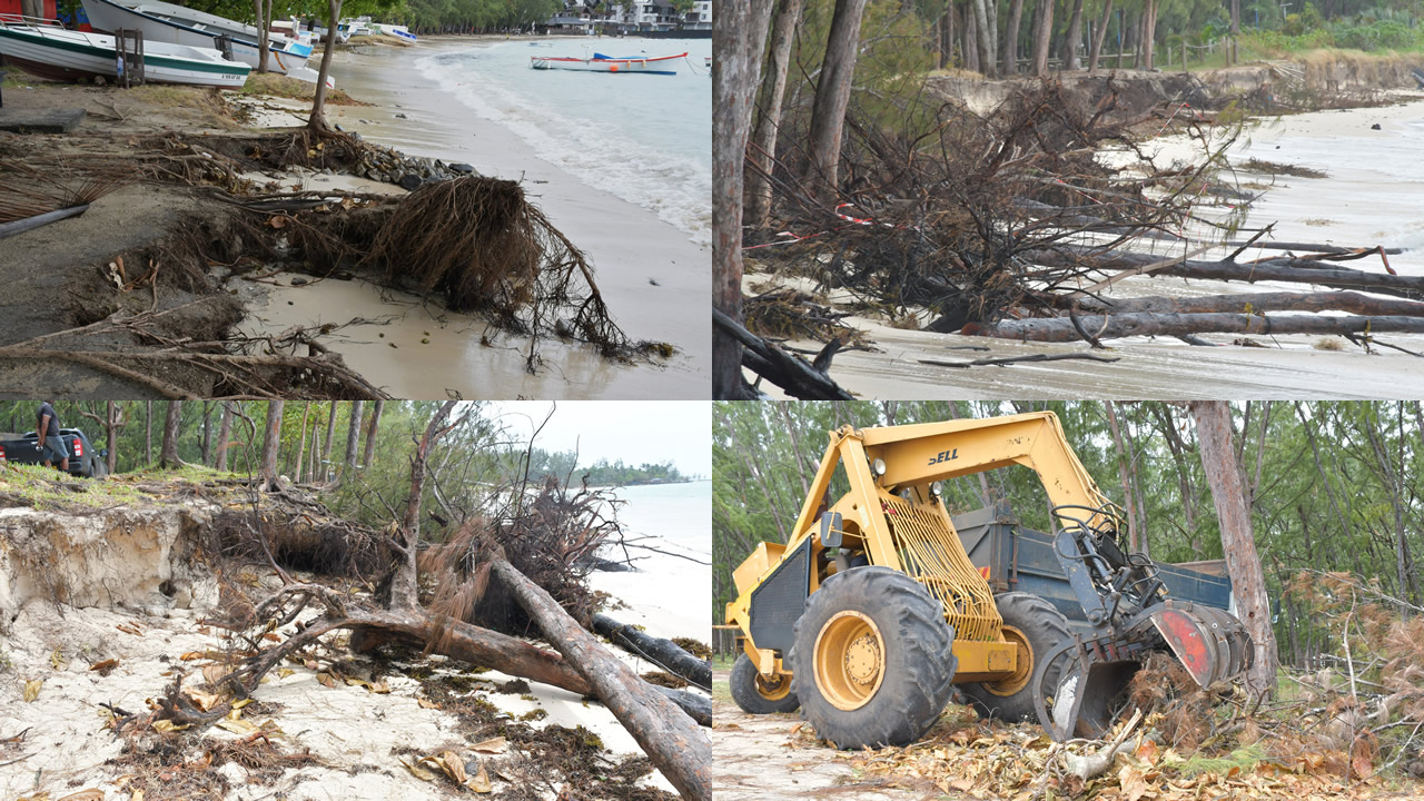 À Grand-Baie, la plage se réduit comme peau de chagrin.Les employés de Maxi Clean déblayant les filaos détruits par les grosses houles.Des champignons poussant sur les troncs d’arbres servent de nourriture aux insectes mais sont détruits.Le tracteur ramasse les débris de filaos entassés à Mont-Choisy.L’érosion causée par les fortes pluies et les grosses vagues entraîne la disparition de nos plages.