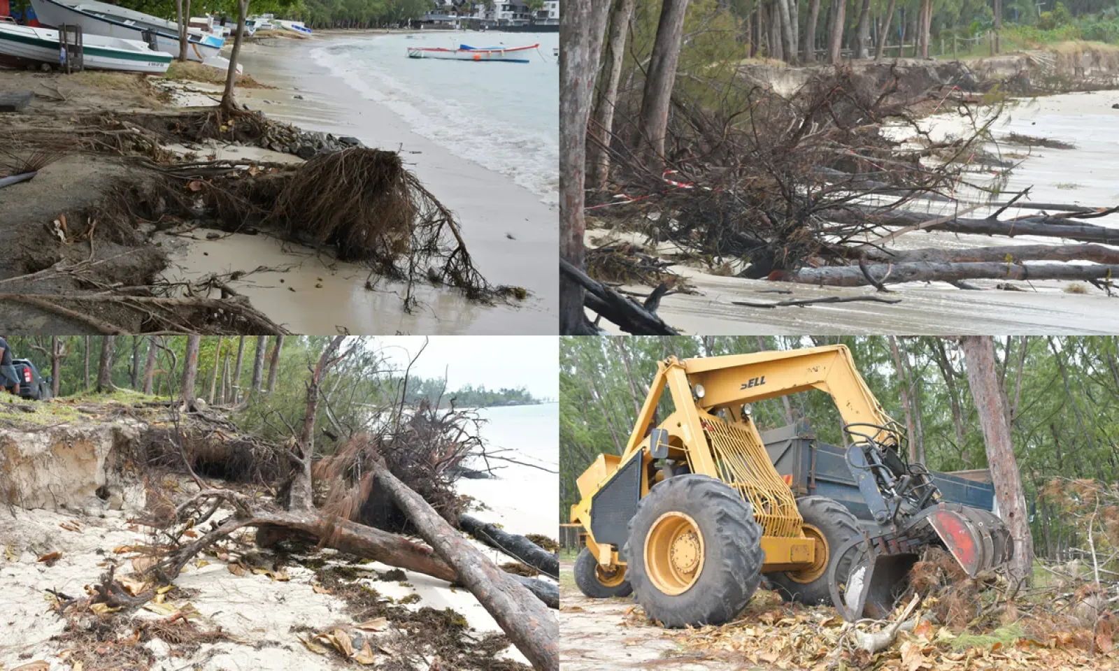 La dégradation de nos plages, causée par les effets des changements climatiques et les cyclones, est clairement visible.L’érosion rend le sable invisible, seules des racines affleurent sous les grosses averses et les houles de plusieurs mètres de hauteur.