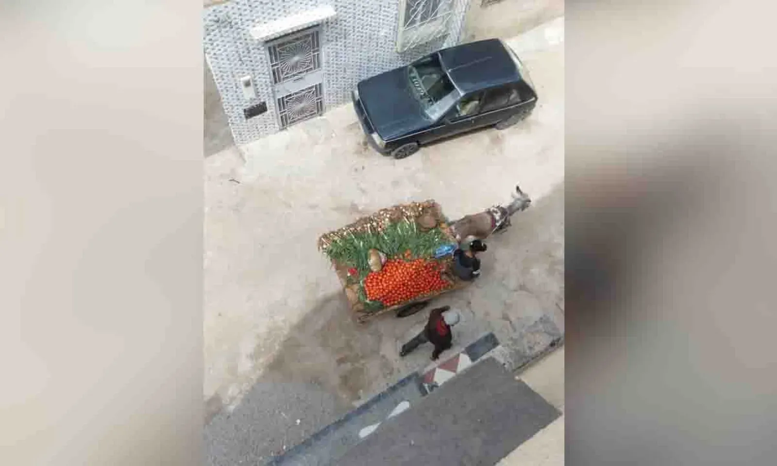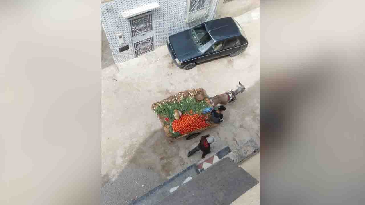 On y voit un marchand, avec sa charrette chargée de légumes tirée par un âne, circulant dans cette ruelle sans susciter d'attroupement ni de querelle de prix. Vous avez bien vu ! Pas de foule, personne ne se bouscule pour acheter, pas d'histoires de prix élevés, pas de pénurie...