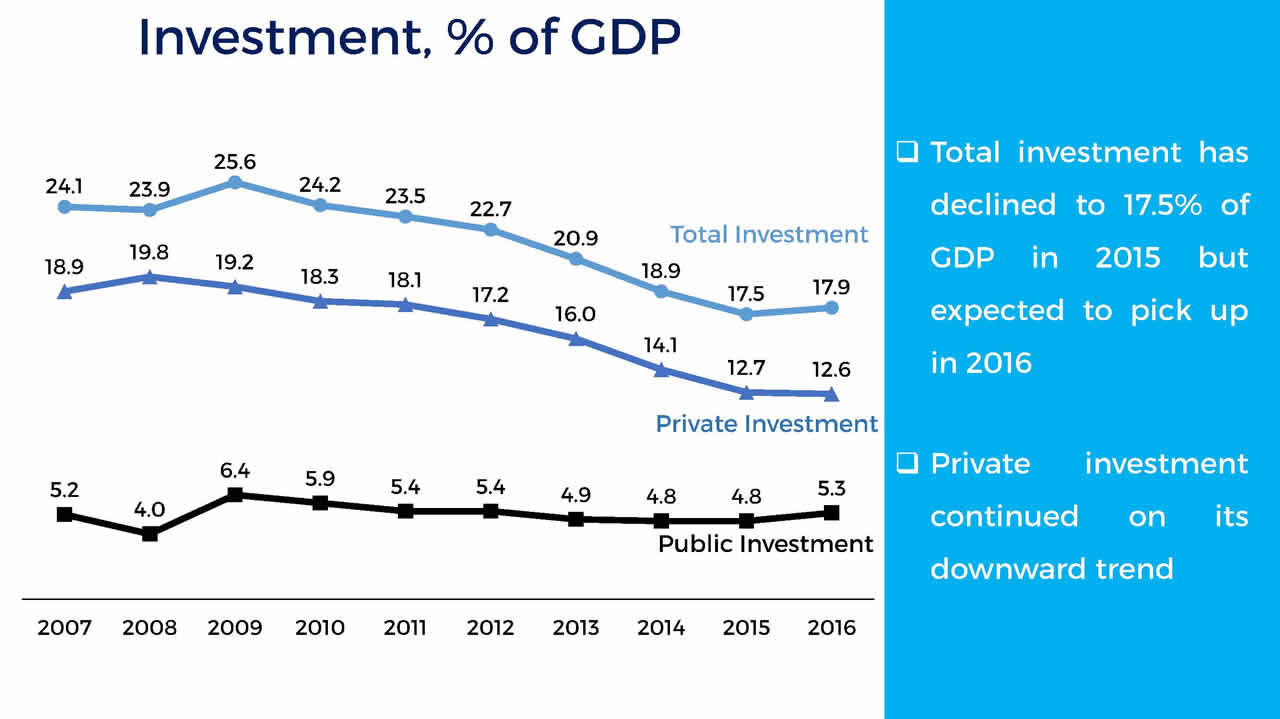 La croissance était estimée à 3,6 % en décembre 2014. À cette époque, le secteur de la construction avait chuté de 8,5 %. L’investissement combiné du public et du privé était de 18,9 %. Celui du privé était à la baisse, avec un taux de 14,1 % alors que l’investissement public était à la hauteur de 4,8 %. Au niveau de l’épargne, la tendance était aussi à la baisse, avec un taux de 10,5 % du Produit intérieur brut (PIB). Le chômage était déjà de 7,8 %, soit 44 800 chômeurs. Les jeunes et les femmes étaient les plus touchés. Cette situation s’explique par l’inadéquation (mismatch) entre la demande du marché et les compétences disponibles. Le taux d’inflation avait atteint les 3,2 % alors que le compte-courant de la balance de paiement était en déficit, équivalant à 5,6 % du PIB. Sur le plan des réserves en devises, la couverture des importations équivalait à 6,2 %, alors que le déficit budgétaire était de 3,2 % et la dette publique de 53,6 % du PIB.