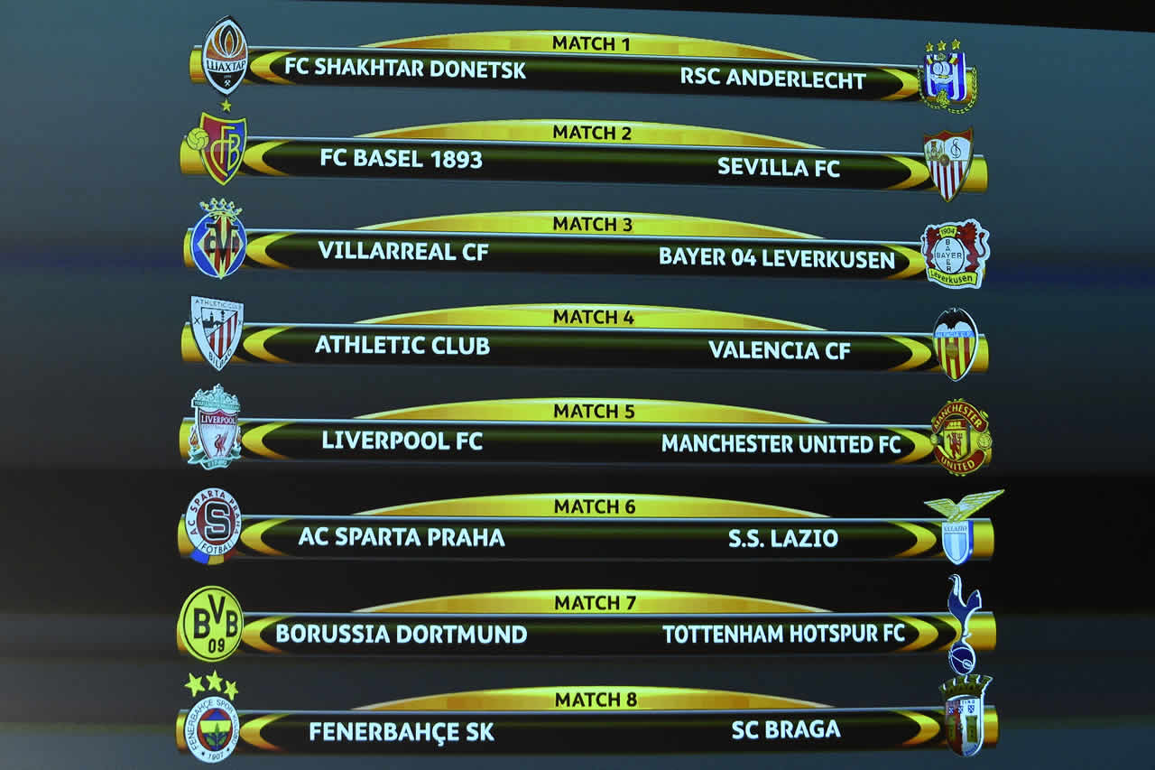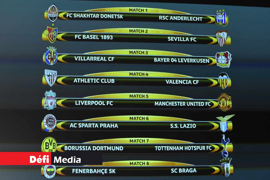 Ce derby entre clubs anglais sera l’affiche de ces 8es, qui verront aussi le troisième club anglais présent Tottenham défier le Borussia Dortmund, et le double tenant du titre Séville affronter le club suisse FC Bâle.