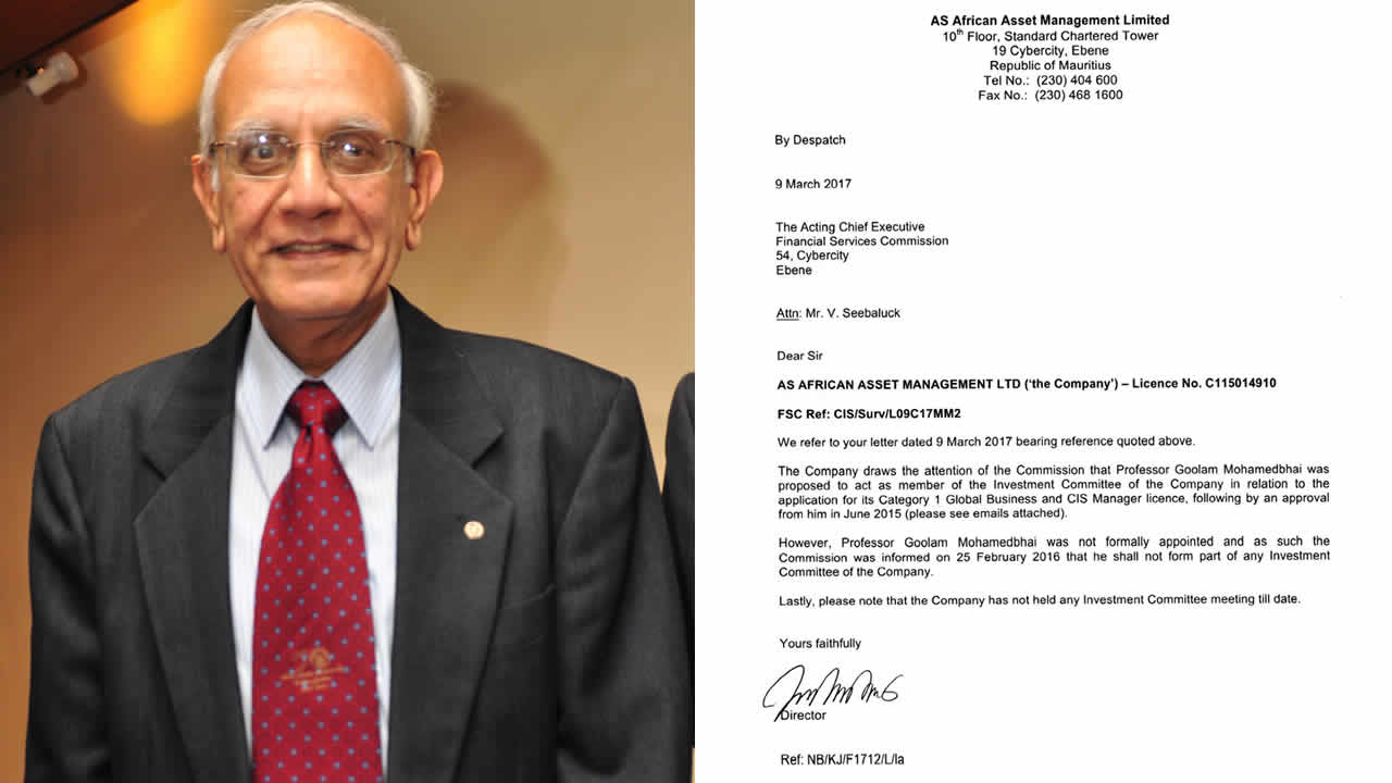 Ce qu’elle fait le même jour en joignant à sa réponse les courriels échangés entre Mauricio Fernandes et Goolam Mohamedbhai. « Prof Goolam Mohamedbhai was proposed to act as member of the investment committee [...] following an approval by him in June 2015 », peut-on lire dans la lettre. Cependant, cette nomination n’a jamais été officialisée et le 25 février 2016, African Asset Management Ltd aurait informé la FSC que le professeur Mohamedbhai ne faisait pas partie du comité, qui n’aurait d’ailleurs pas tenu de réunion jusqu’à cette date.