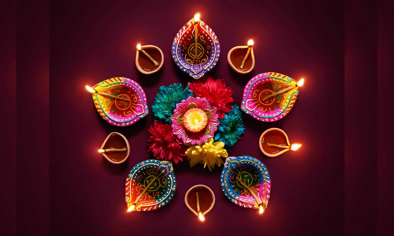 Le diya est une lampe allumée pour Divali à des fins de culte et de décoration. Les diyas peuvent être simples, colorés, sophistiqués, grands ou petits. Traditionnellement, ils sont fabriqués à partir d’argile, puis remplis d’huile pour être allumés. Ils illuminent les maisons et les jardins.