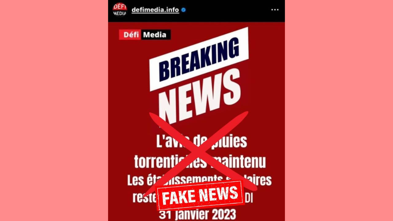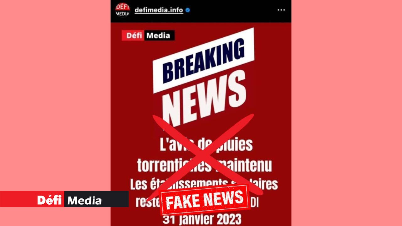 Un post portant le logo du Défi Media, avec les phrases suivantes « L’avis de pluies torrentielles maintenu. Les établissements scolaires restent fermés ce mardi 31 janvier », circule sur les réseaux sociaux depuis cet après-midi. Il s’agit bien sûr d’une « fake news ». Aucun avertissement de pluies torrentielles n’est en vigueur à Maurice. Le ministère de l’Éducation n’a émis aucun communiqué pour annoncer la fermeture des établissements scolaires pour ce mardi 31 janvier.