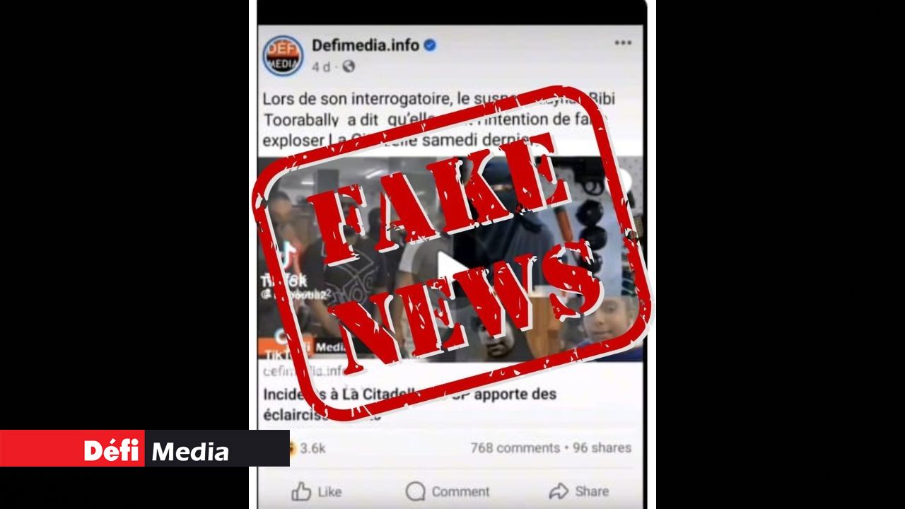 Il a été porté à notre connaissance ce dimanche 29 octobre qu'une vidéo portant le logo du Défi Media, accompagnée d'une voix-off et de la légende suivante : "Lors de son interrogatoire, le suspect Zaynah Bibi Toorabally a dit qu'elle avait l'intention de faire exploser la Citadelle samedi dernier" circule sur TikTok. Il est important de souligner qu'il s'agit d'une "fake news". En effet, Le Défi Media Group n'a jamais publié cette vidéo sur son compte TikTok ni sur sa page Facebook.