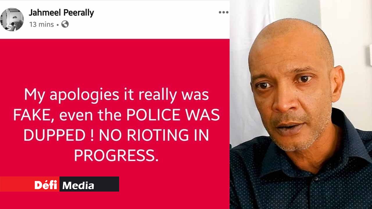 L'activiste Jahmeel Peerally a ensuite supprimé ce ‘post’ sur Facebook et s'est excusé dans la foulée. « My apologies it really was Fake, even the POLICE WAS DUPPED! NO RIOTING IN PROGRSS», a-t-il écrit.