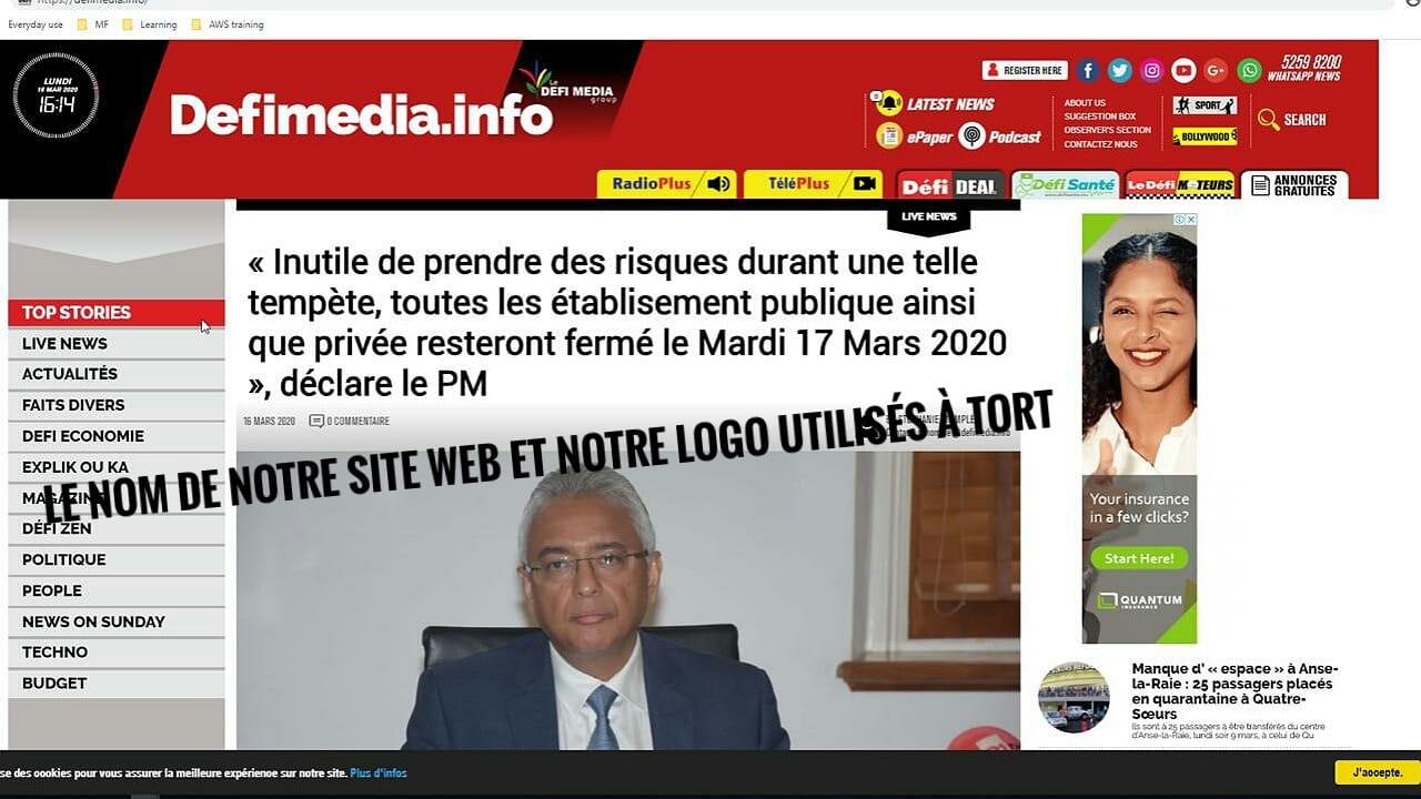 Il a été porté à notre connaissance lundi soir que le nom de notre site web et notre logo ont été utilisés à tort pour la diffusion d'une fausse nouvelle ayant pour titre (nous reproduisons le titre tel qu'il a été publié) : « 'Inutile de prendre des risques durant une telle tempète, toutes les établissements publique ainsi que privée resteront fermé le Mardi 17 Mars 2020, déclare le PM'».