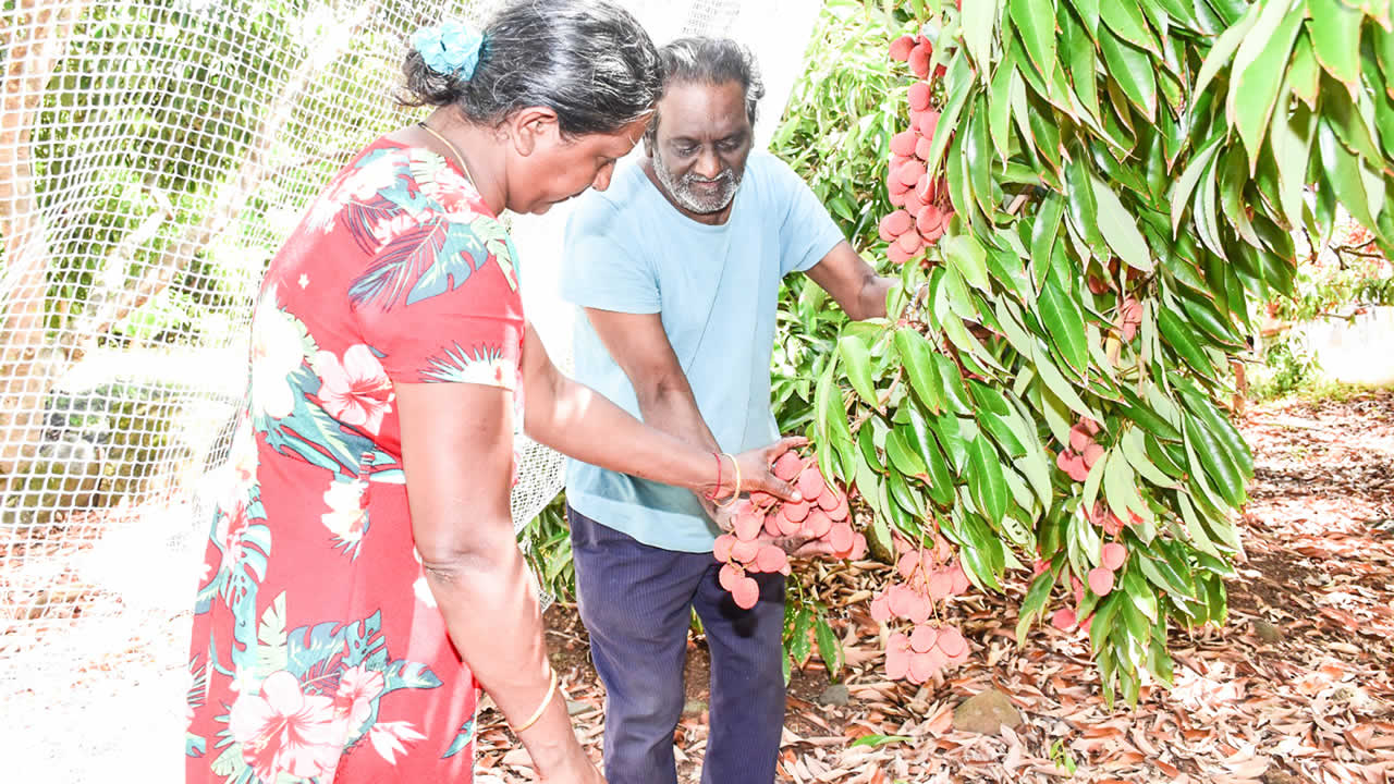 Sunita Devi Naikoo, fille de Dayaram, partage que s’occuper d’un verger de letchis requiert une patience inébranlable. « Au début, quand les letchis sont petits, il faut surveiller les chauves-souris. Puis, une fois qu’ils ont grossi, il faut protéger les fruits des voleurs. Ces derniers viennent souvent armés de sabres ou de bâtons. C’est dangereux, et nous avons peur, mais ‘nou manz r li’ », raconte-t-elle.