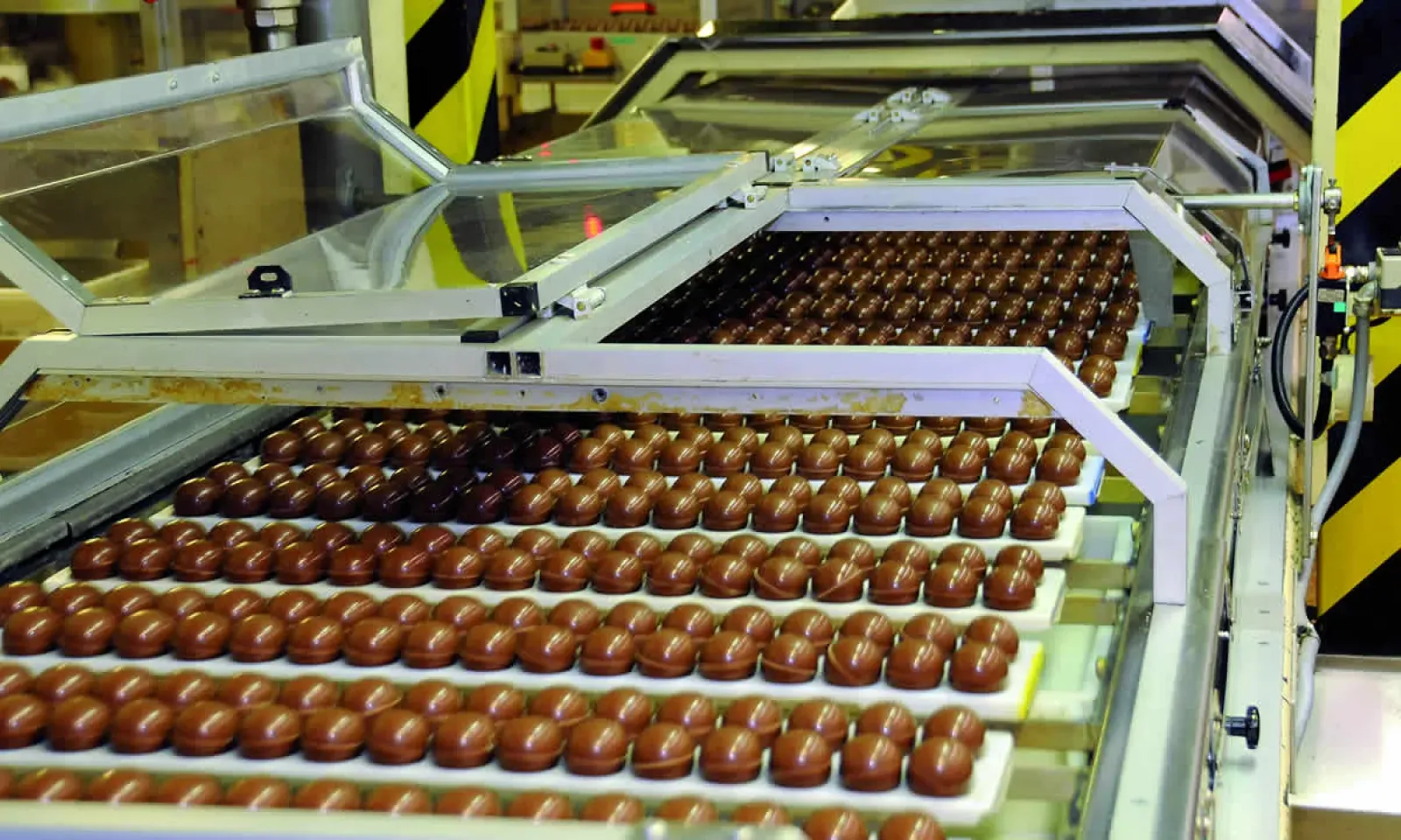 La production des Ferrero Rocher a, elle, quelque chose de magique: un biscuit taillé en coupelles à l'intérieur desquelles les machines versent du Nutella avant de déposer une noisette au milieu. Les coupes sont alors collées deux par deux pour former une boule recouverte ensuite de noisettes broyées et de chocolat.