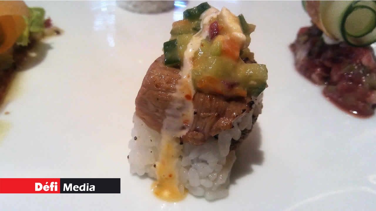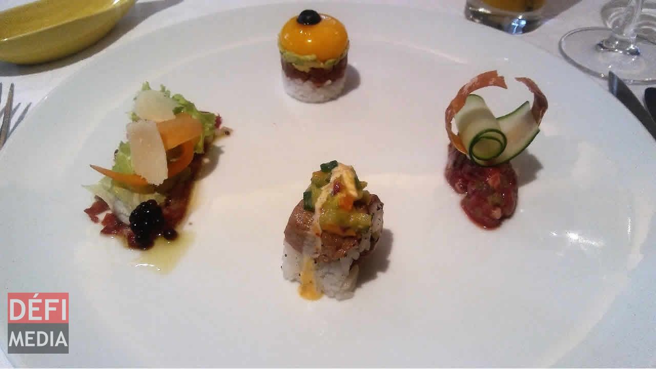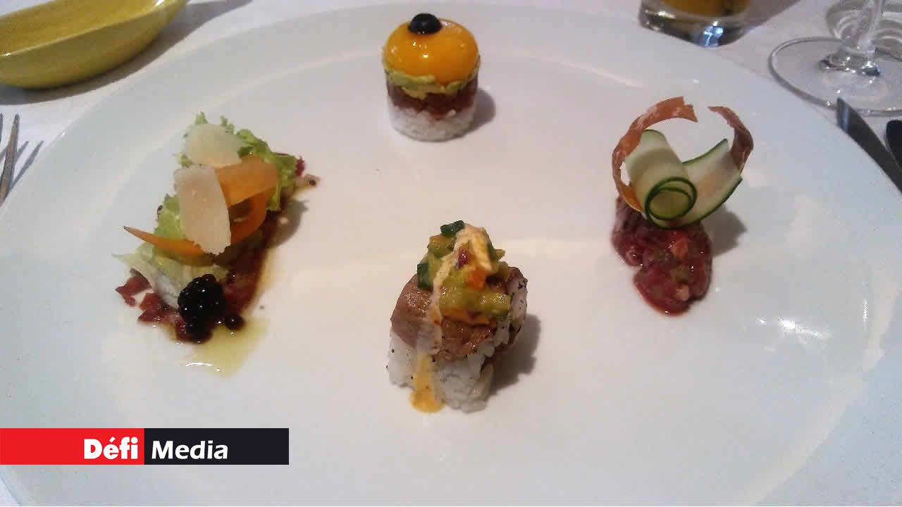 Pour l’entrée, vous aurez droit à quatre choix. Dans le style européen, vous retrouverez le carpaccio de bœuf, aux copeaux de parmesan et filet d’huile d’olive, ou le tartare de bœuf accompagné d’un toast brioché. Du côté du Japon, le chef Thierry St Mart vous présentera la feuille de bœuf au riz nishiki, avocat et jaune d’œuf, sauce soja, et quatre pièces de California Rolls au bœuf, grillées et marinées avec de la mayonnaise sriracha.