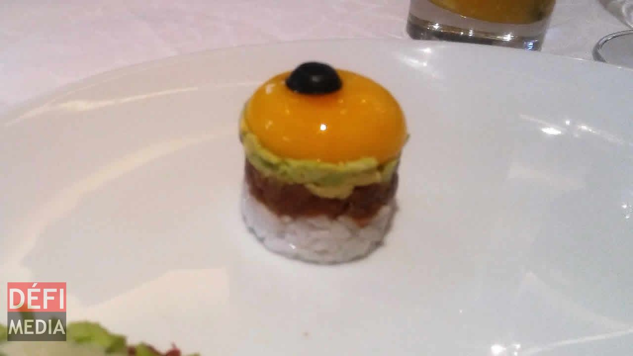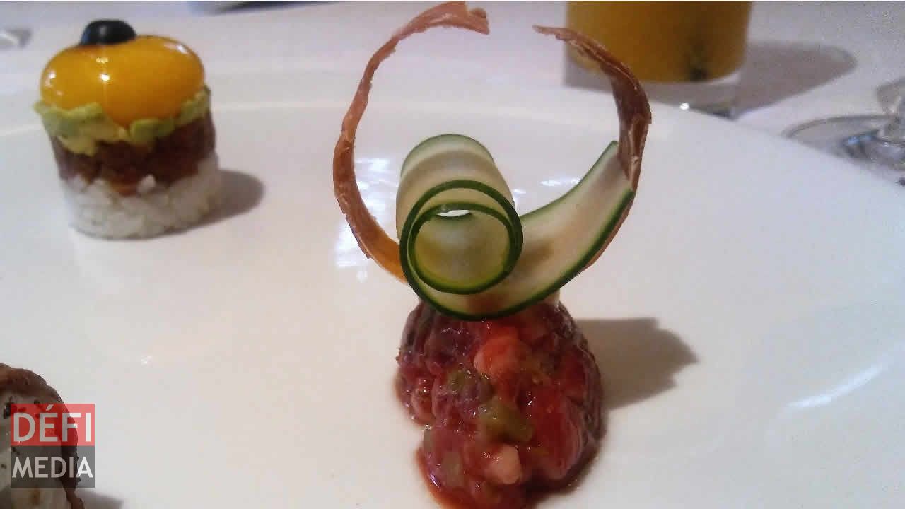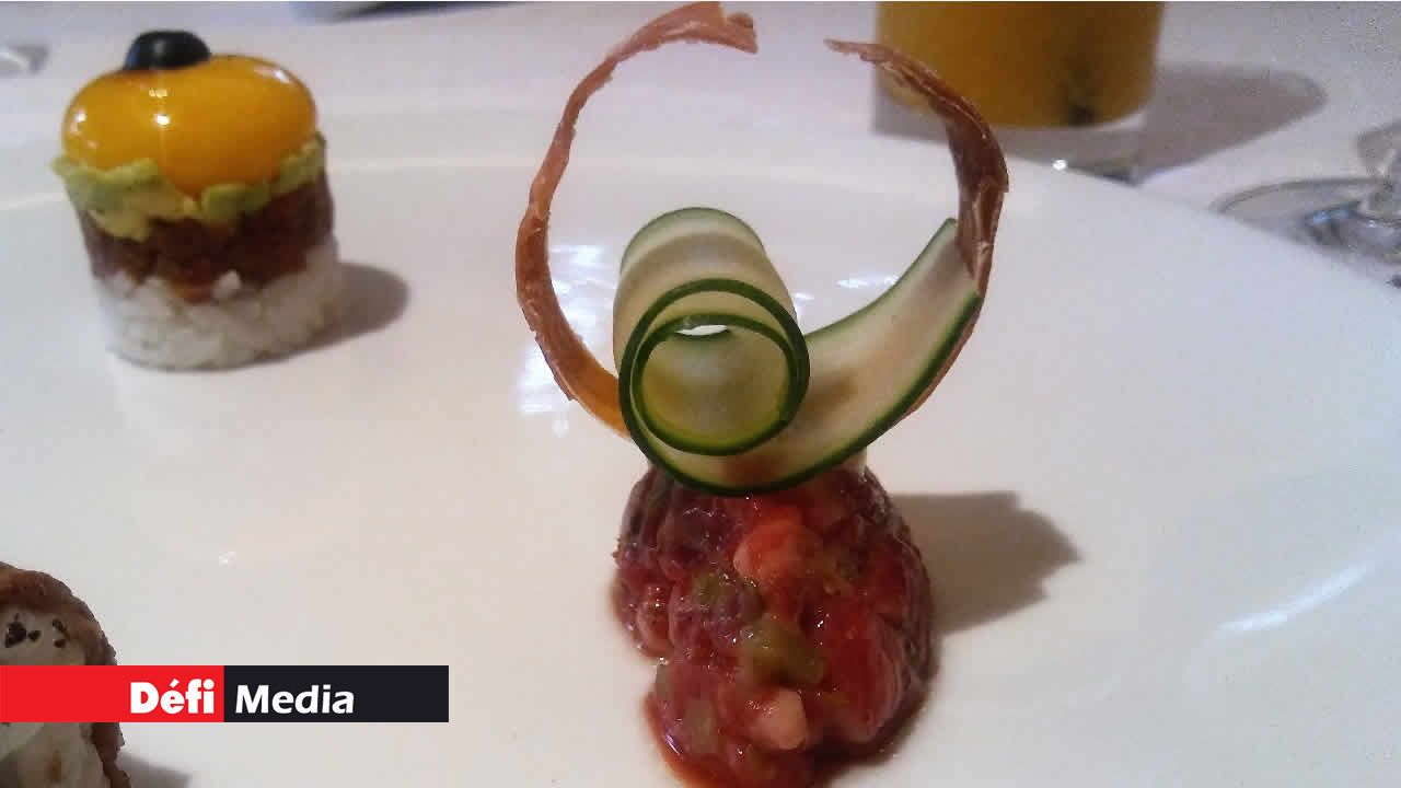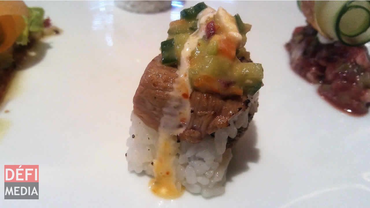 Pour l’entrée, vous aurez droit à quatre choix. Dans le style européen, vous retrouverez le carpaccio de bœuf, aux copeaux de parmesan et filet d’huile d’olive, ou le tartare de bœuf accompagné d’un toast brioché. Du côté du Japon, le chef Thierry St Mart vous présentera la feuille de bœuf au riz nishiki, avocat et jaune d’œuf, sauce soja, et quatre pièces de California Rolls au bœuf, grillées et marinées avec de la mayonnaise sriracha.