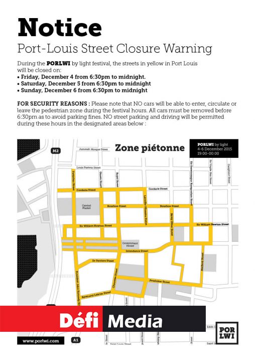 Plusieurs rues de Port-Louis seront fermées à la circulation en soirée vendredi 4 décembre, samedi 5 décembre et dimanche 6 décembre dans le cadre du festival Porlwi by Light.